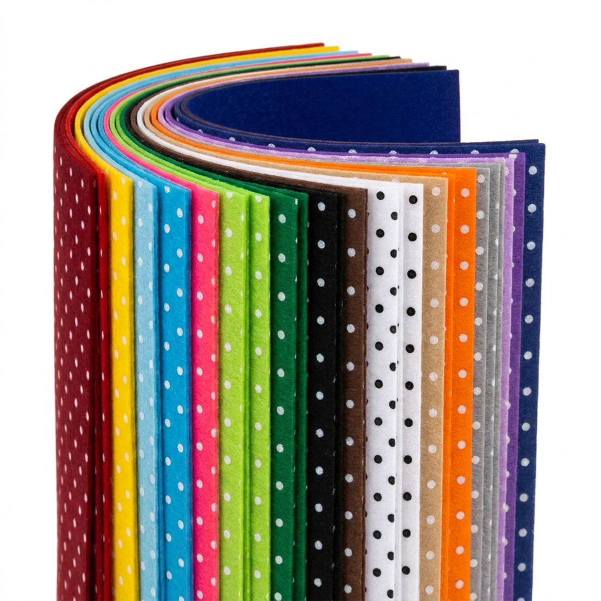 Фетр декоративный с рисунком в горошек. Мягкий. Толщина фетра - 1 мм Состав: 100% полиэстер Фетр используется для создания различных декоративных элементов: бус, браслетов и заколок для волос, декора для мебели, ковриков, диванных подушек, кашпо для цветов, подставок под