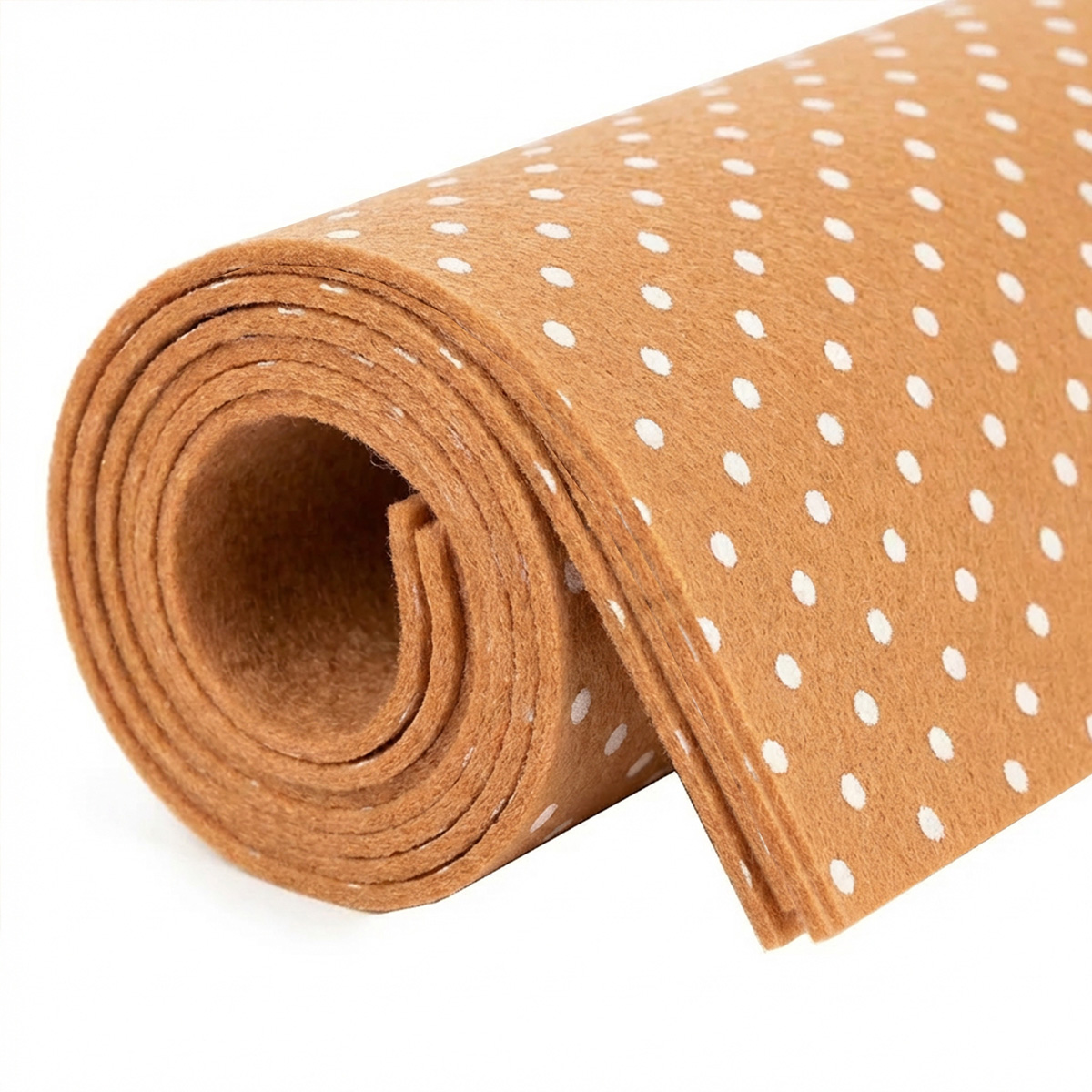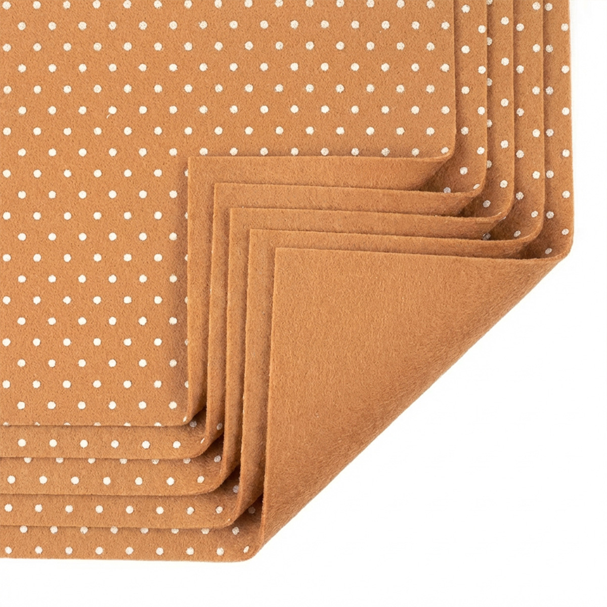 Фетр декоративный с рисунком в горошек. Мягкий. Толщина фетра - 1 мм Состав: 100% полиэстер Фетр используется для создания различных декоративных элементов: бус, браслетов и заколок для волос, декора для мебели, ковриков, диванных подушек, кашпо для цветов, подставок под