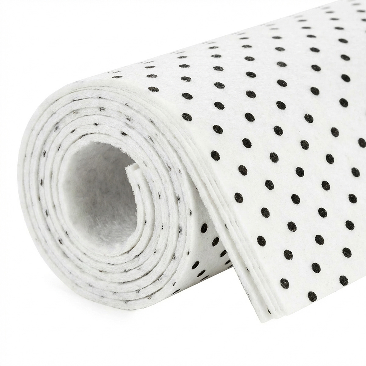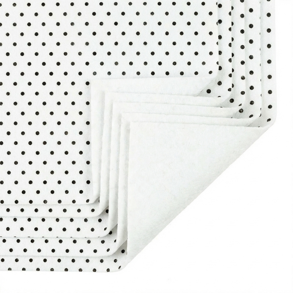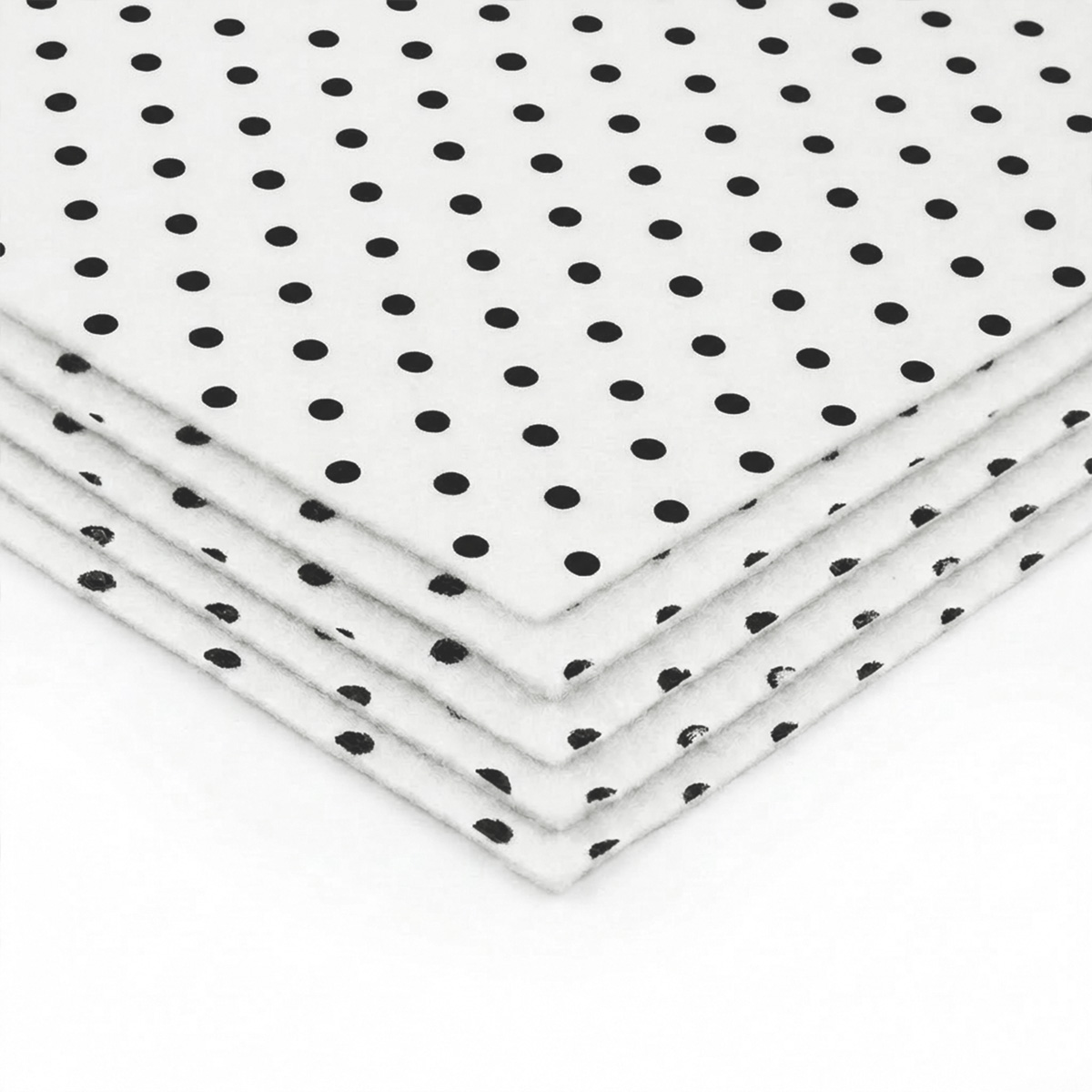 Фетр декоративный с рисунком в горошек. Мягкий. Толщина фетра - 1 мм Состав: 100% полиэстер Фетр используется для создания различных декоративных элементов: бус, браслетов и заколок для волос, декора для мебели, ковриков, диванных подушек, кашпо для цветов, подставок под