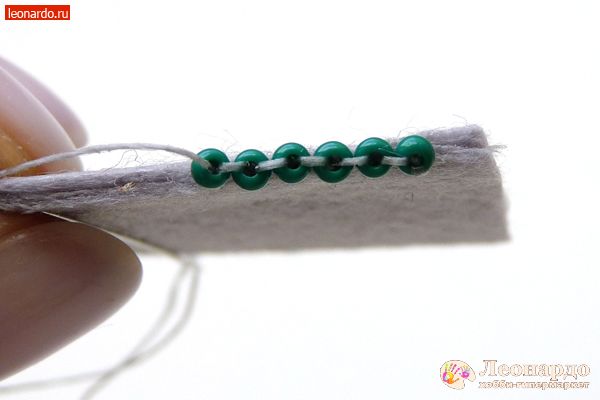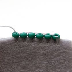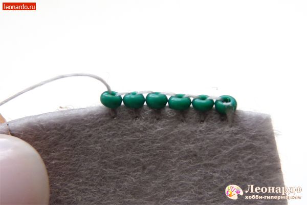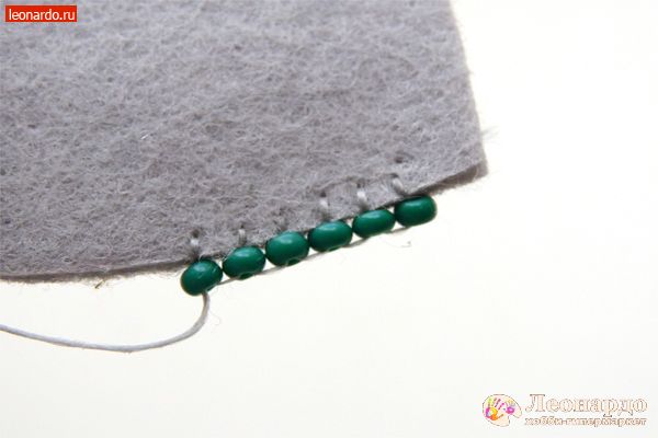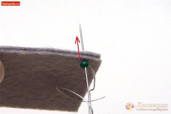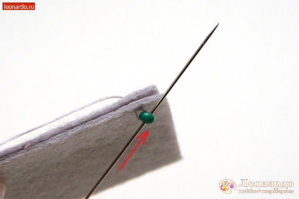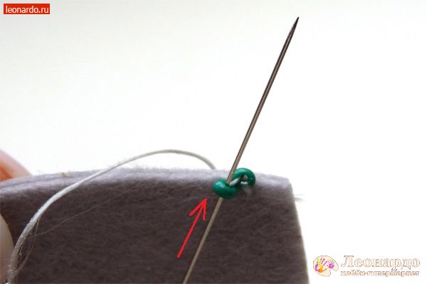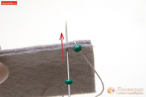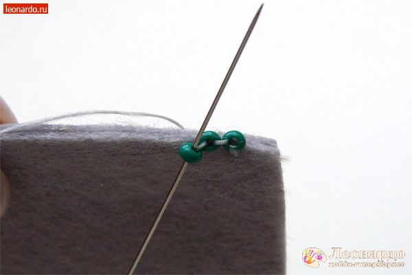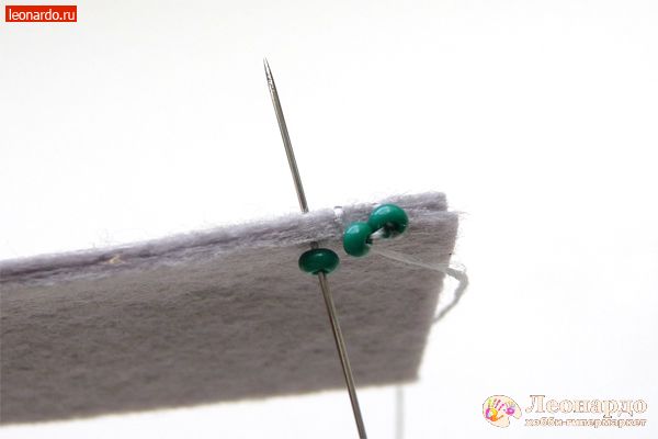 4. Вводим иглу с нанизанной бисериной с лицевой стороны, протыкая два кусочка фетра насквозь.
