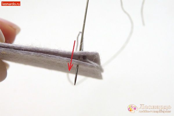 2. Вводим иглу с нитью между кусочками фетра. На конце иглы делаем узелок.