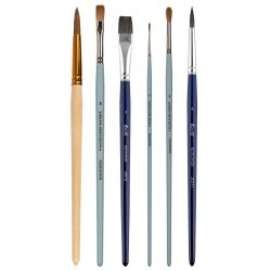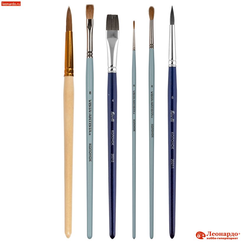 Универсальными считаются круглые кисти из колонка. Ими хорошо как выполнять заливки, так и прописывать детали. Выбор номера зависит от формата работы, универсальными считаются номера 04 и 08. Плоские колонковые кисти используют для заливки простых форм и дополнительного смачивания фрагментов рисунка при письме по сырому в акварельной живописи. Базовый набор состоит из двух кистей – номер 04 и номер 08.