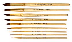 Наиболее популярны и универсальны круглые кисти из волоса пони. Поскольку основное предназначение кистей – это детское и декоративное творчество, размерный ряд невелик. Волос пони с трудом собирается в конус, поэтому рекомендуем иметь в арсенале не менее трех кистей – номера 01, 06, 08.