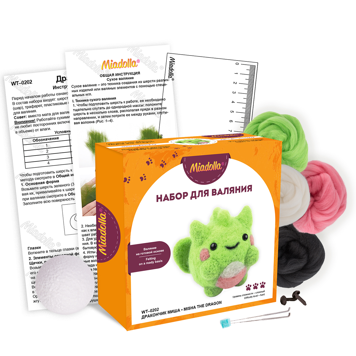 В набор входят все необходимые материалы для изготовления игрушки: игла для валяния, шерсть для валяния, основа для изделия, пластиковый трафарет и подробная пошаговая инструкция с картинками. Упаковка: Коробка 15 x 15 x 6.5 см