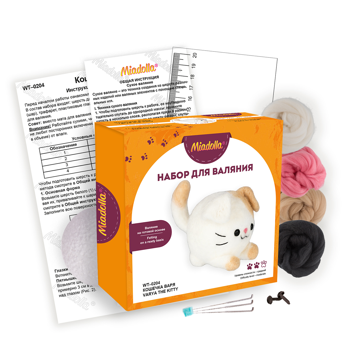 В набор входят все необходимые материалы для изготовления игрушки: игла для валяния, шерсть для валяния, основа для изделия, пластиковый трафарет и подробная пошаговая инструкция с картинками. Упаковка: Коробка 15 x 15 x 6.5 см