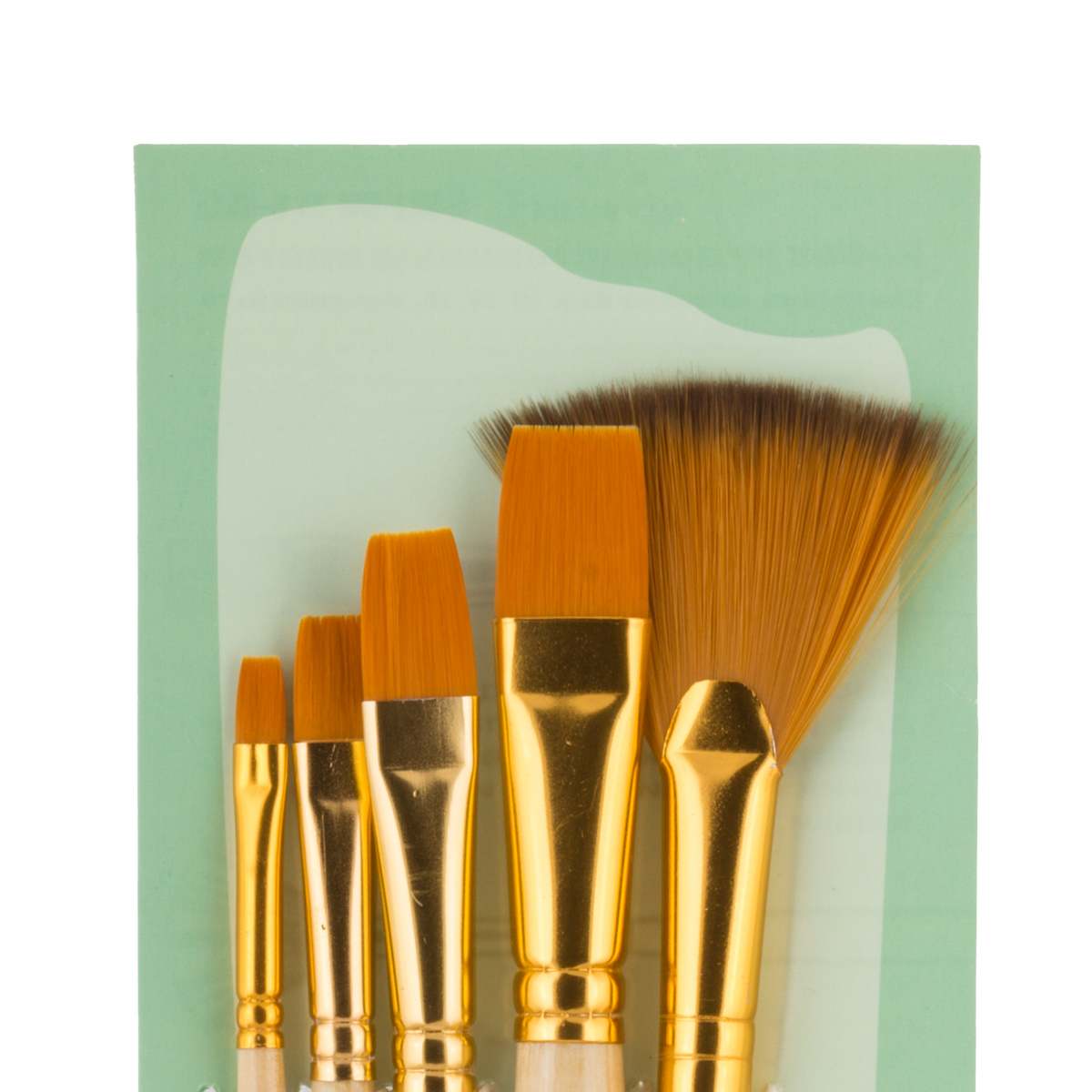 Набор включает кисти из синтетики. Форма: плоская Размеры: 6, 10, 14, 18 Форма: веерная Размер: 14 Плоские кисти предназначены для работы на крупных участках холста, так как позволяют наносить широкие и ровные мазки. Веерная форма кисти позволяет растушевать краску, уже нанесенную на основу. Незаменима при создании портрета или передачи света и тени на холсте; помогает смягчить контуры краски, удалить фактуру мазка и т.п. Прекрасно подходят для создания плавного перехода между несколькими цветами. Кисти из Синтетики прочные, упругие, эластичные, что способствует хорошей наполняемости кисти и ровному нанесению краски. Предназначены для работ с тяжелыми красками: маслом, акрилом, темперой, гуашью; хорошо удерживают жидкость.