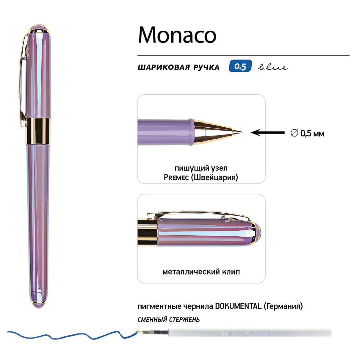 Ручки "Monaco" от Bruno Visconti для тех, кто ценит качество, основательность и продуманность каждой детали. В ней нет ничего лишнего, но она привлекает к себе внимание. Несмотря на увеличенный диаметр корпуса - 12 мм, она изящна благодаря плавным линиям. Чернила Dokumental [Германия] и швейцарский пишущий узел Premec –гарантируют качество и не подведут при подписании судьбоносных документов. Ну а покрытие корпуса Soft Touch создаст комфорт при письме. Встретив ручку "Monaco" однажды – уже не захочется с ней расстаться.