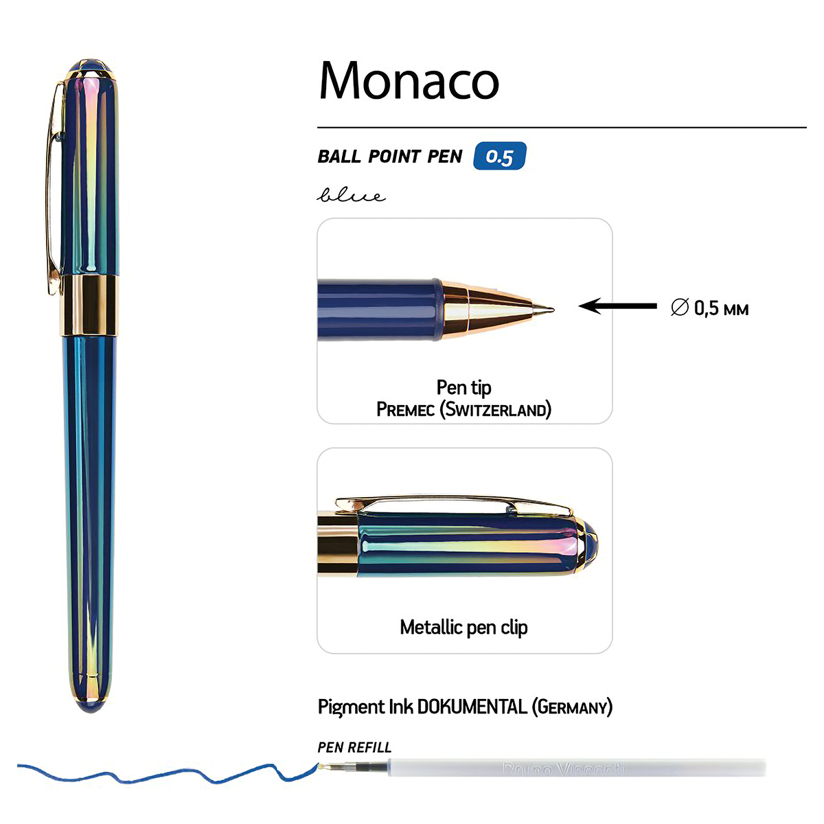 Ручки "Monaco" от Bruno Visconti для тех, кто ценит качество, основательность и продуманность каждой детали. В ней нет ничего лишнего, но она привлекает к себе внимание. Несмотря на увеличенный диаметр корпуса - 12 мм, она изящна благодаря плавным линиям. Чернила Dokumental [Германия] и швейцарский пишущий узел Premec –гарантируют качество и не подведут при подписании судьбоносных документов. Ну а покрытие корпуса Soft Touch создаст комфорт при письме. Встретив ручку "Monaco" однажды – уже не захочется с ней расстаться.