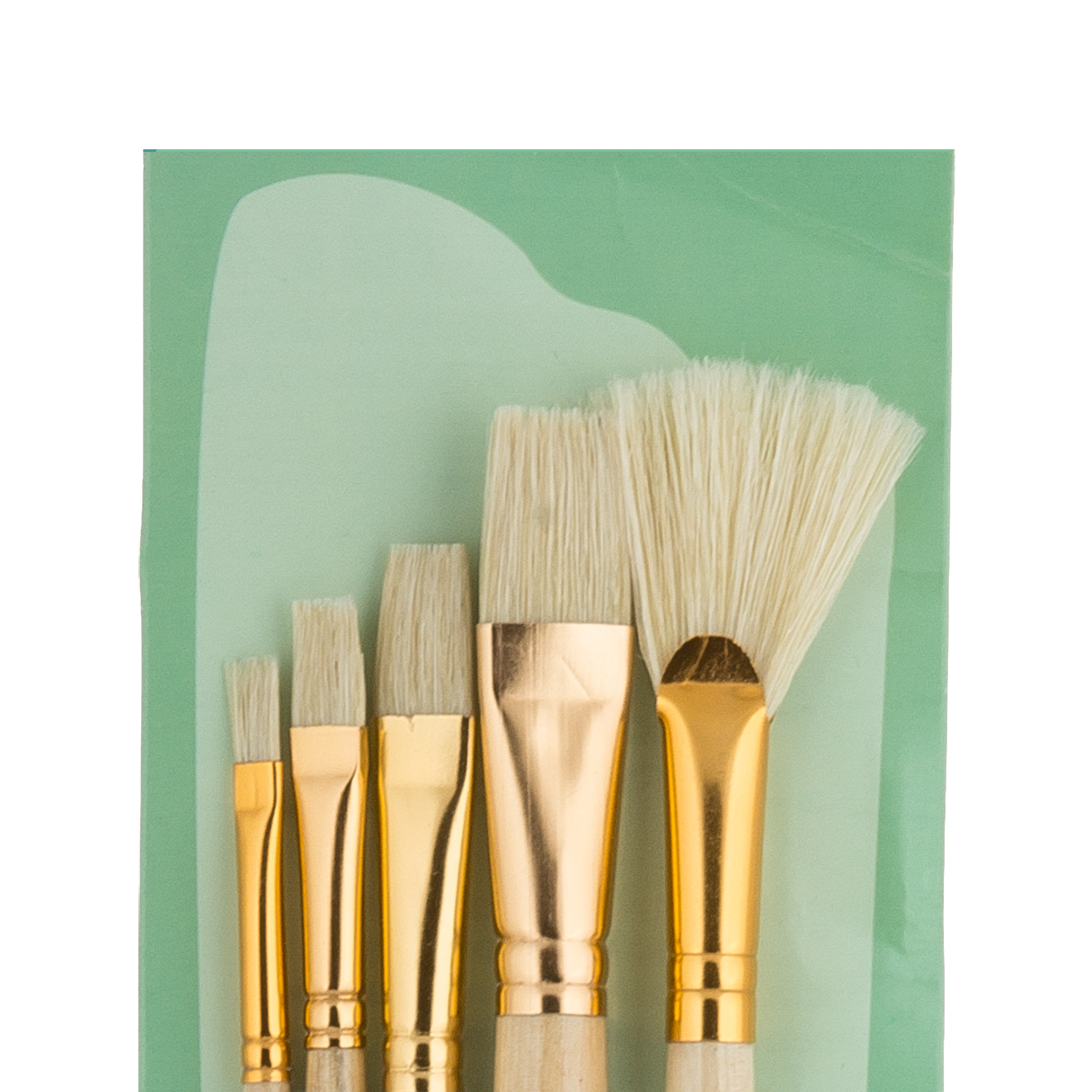 Набор включает кисти из щетины. Форма: плоская Размеры: 6, 10, 14, 18 Форма: веерная Размер: 14 Кисти щетина изготовлены из обработанного свиного волоса. Волос достаточно толстый, упругий. Хорошая наполняемость кисти и ровное нанесение краски на поверхность обеспечивается расщепленными кончиками волосков. Подходит для работы с "тяжелыми" красками: маслом, акрилом, темперой и гуашью. Также используются опытными акварелистами, работающими с холстом. Плоские кисти предназначены для работы на крупных участках холста, так как позволяют наносить широкие и ровные мазки. Веерная форма кисти позволяет растушевать краску, уже нанесенную на основу. Незаменима при создании портрета или передачи света и тени на холсте; помогает смягчить контуры краски, удалить фактуру мазка и т.п. Прекрасно подходят для создания плавного перехода между несколькими цветами.