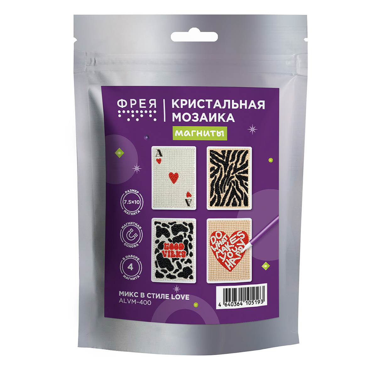В набор ТМ ФРЕЯ "Кристальная мозаика" входит: - магнитная основа с клеевым слоем и защитной плёнкой: 4 шт, - стилус и восковая подушечка, - круглые стразы: 4 цвета, с запасом более 20%, - картонный лоток, - инструкция.