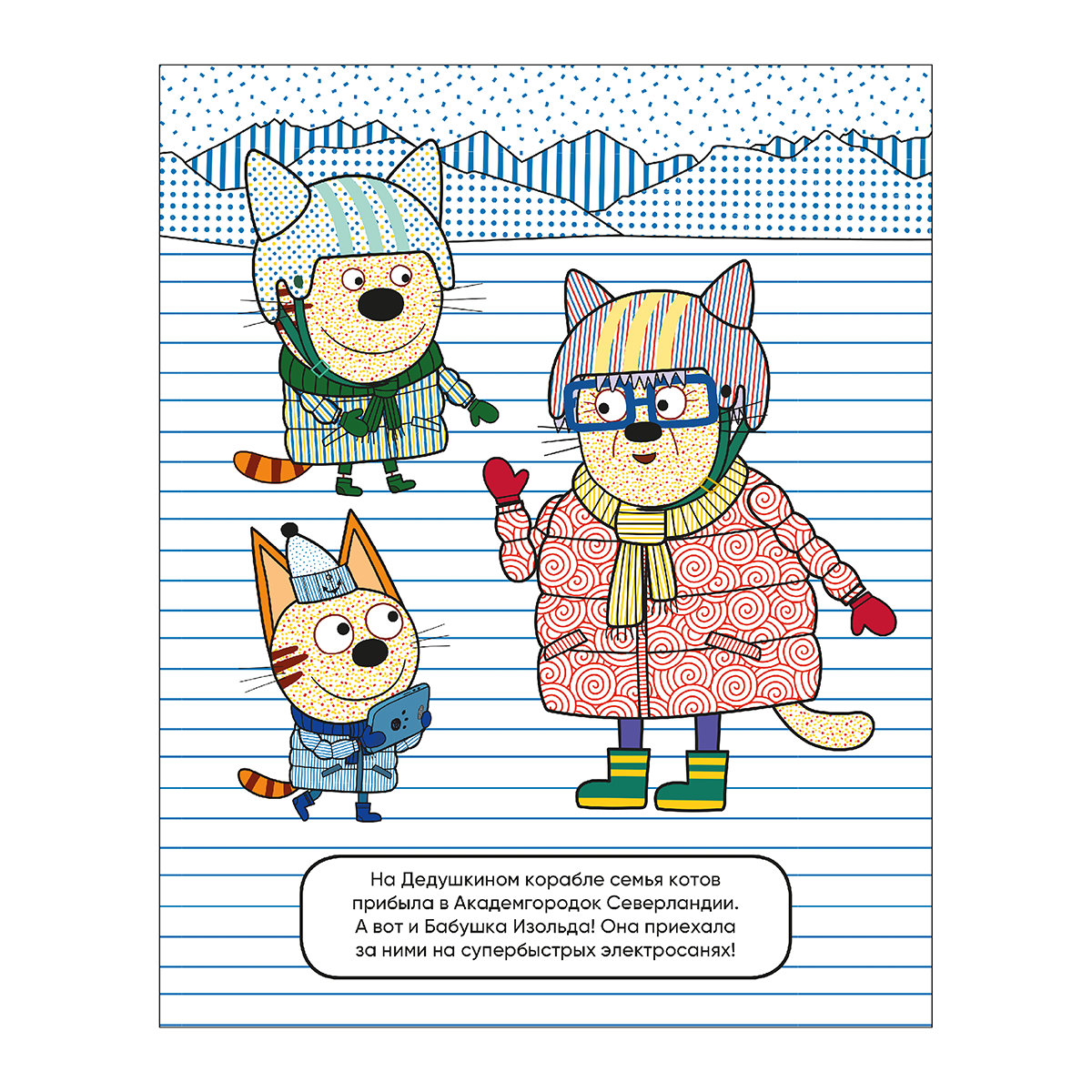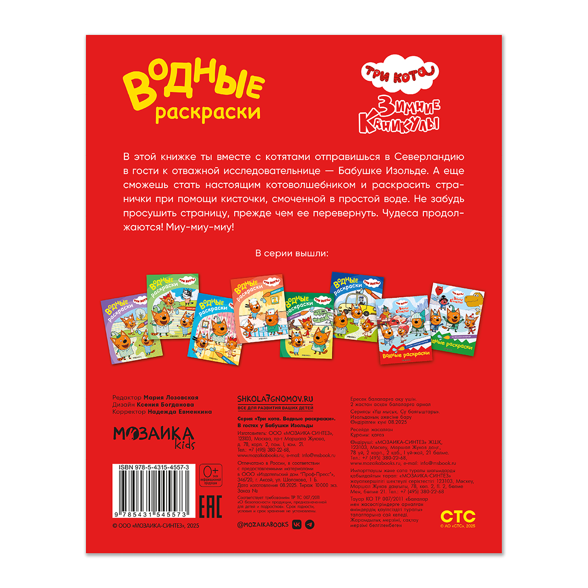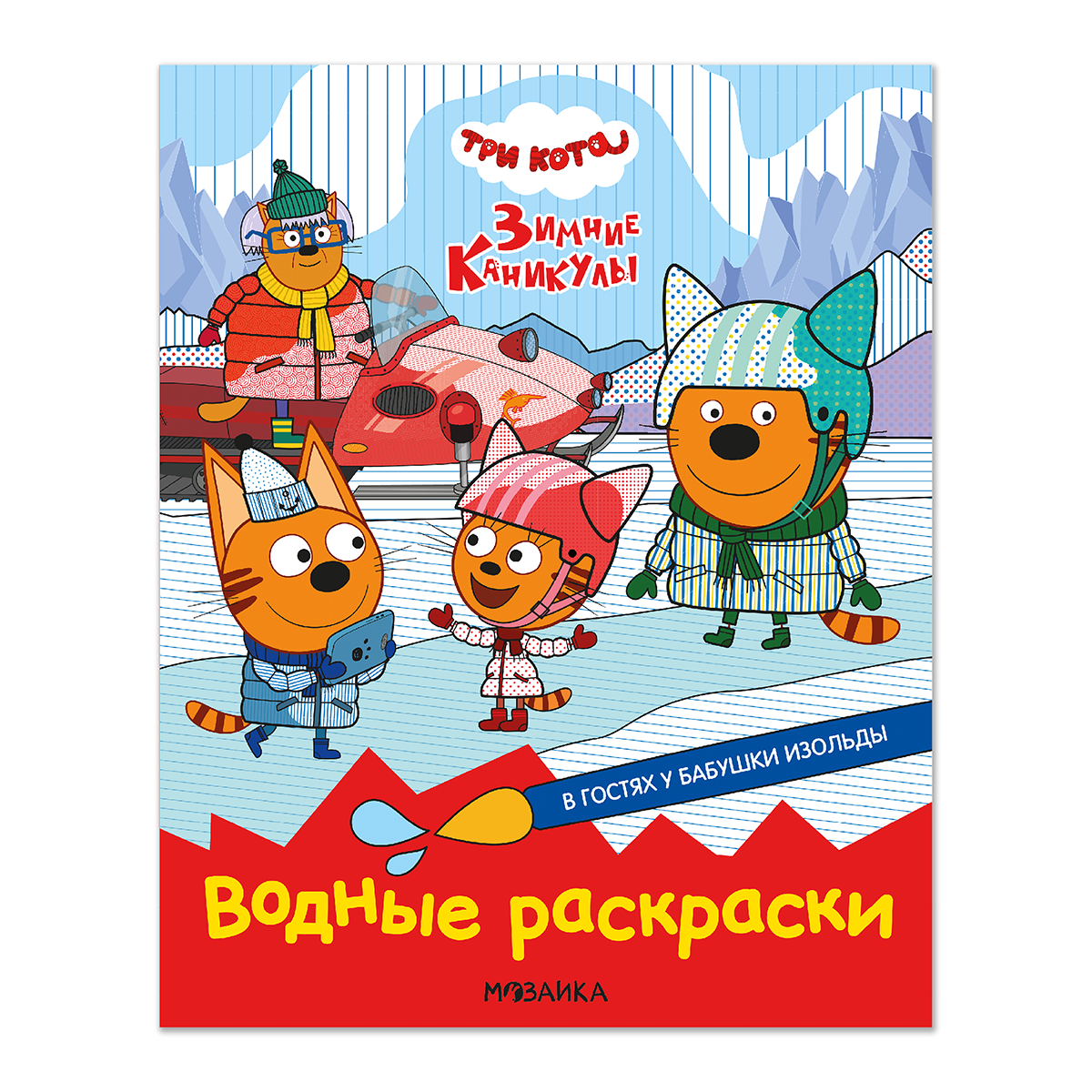 В гостях у Бабушки Изольды [Три кота. Водные раскраски], водная раскраска С книжкой «В гостях у Бабушки Изольды» из серии «Три кота. Водные раскраски» ребенок весело проведет время вместе с любимыми героями полнометражного мультфильма «Три кота. Зимние каникулы». А еще сможет стать настоящим котоволшебником, раскрасив странички при помощи смоченной в воде кисточки. Каждая иллюстрация очень яркая и находится на отдельном листе. Но не забывайте просушивать страницу, прежде чем ее перевернуть и приступить к следующей картинке. Водные раскраски отлично способствуют развитию творческого мышления и мелкой моторики.