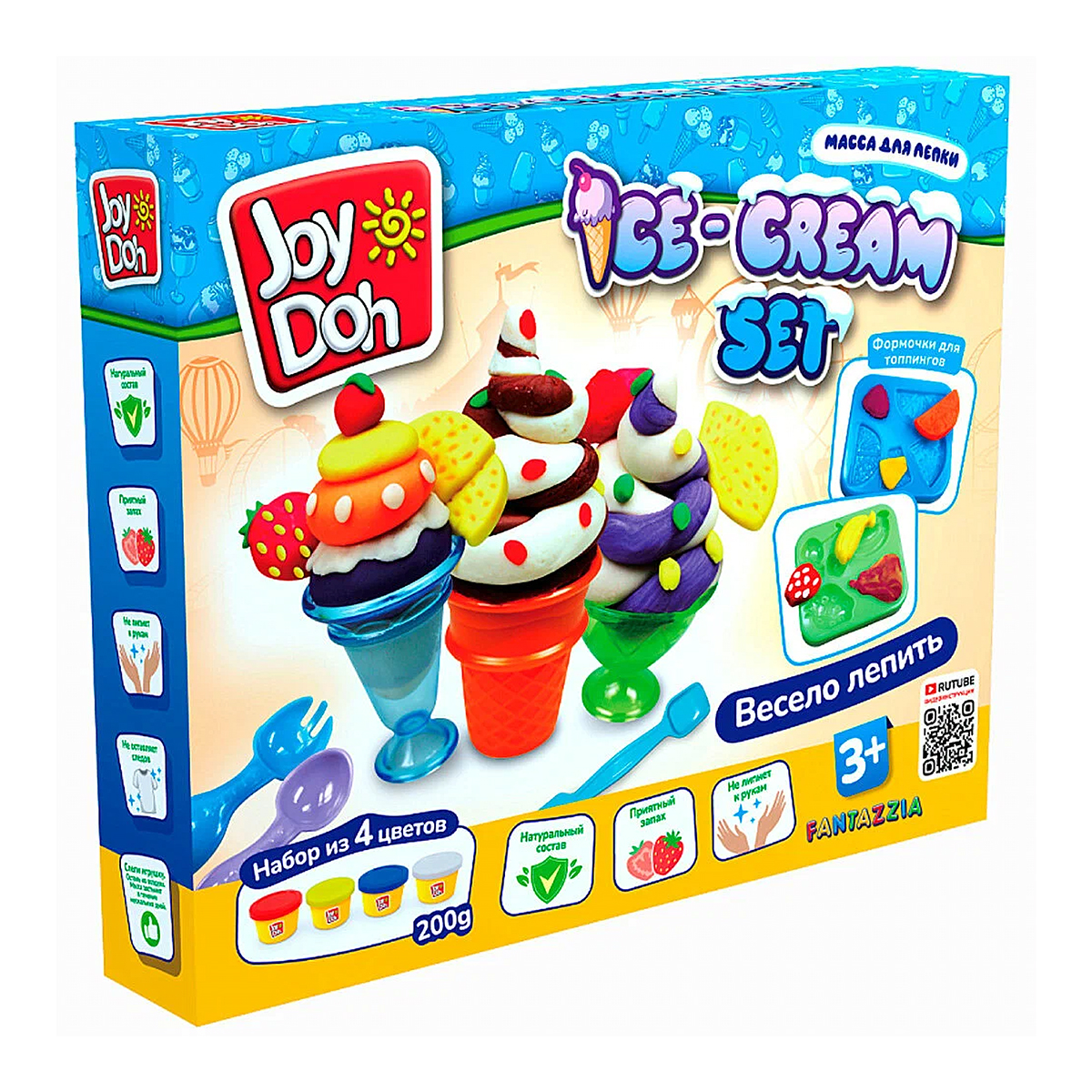 Масса для лепки Joy Doh, набор ICE-CREAM SET - МОРОЖЕНОЕ, доп. пресс-формы для фруктов, 10 аксессуаров, 4 баночки с тестом, [4 х 50г.]Изготовлена из пищевых компонентов и безопасна для вашего ребенка.