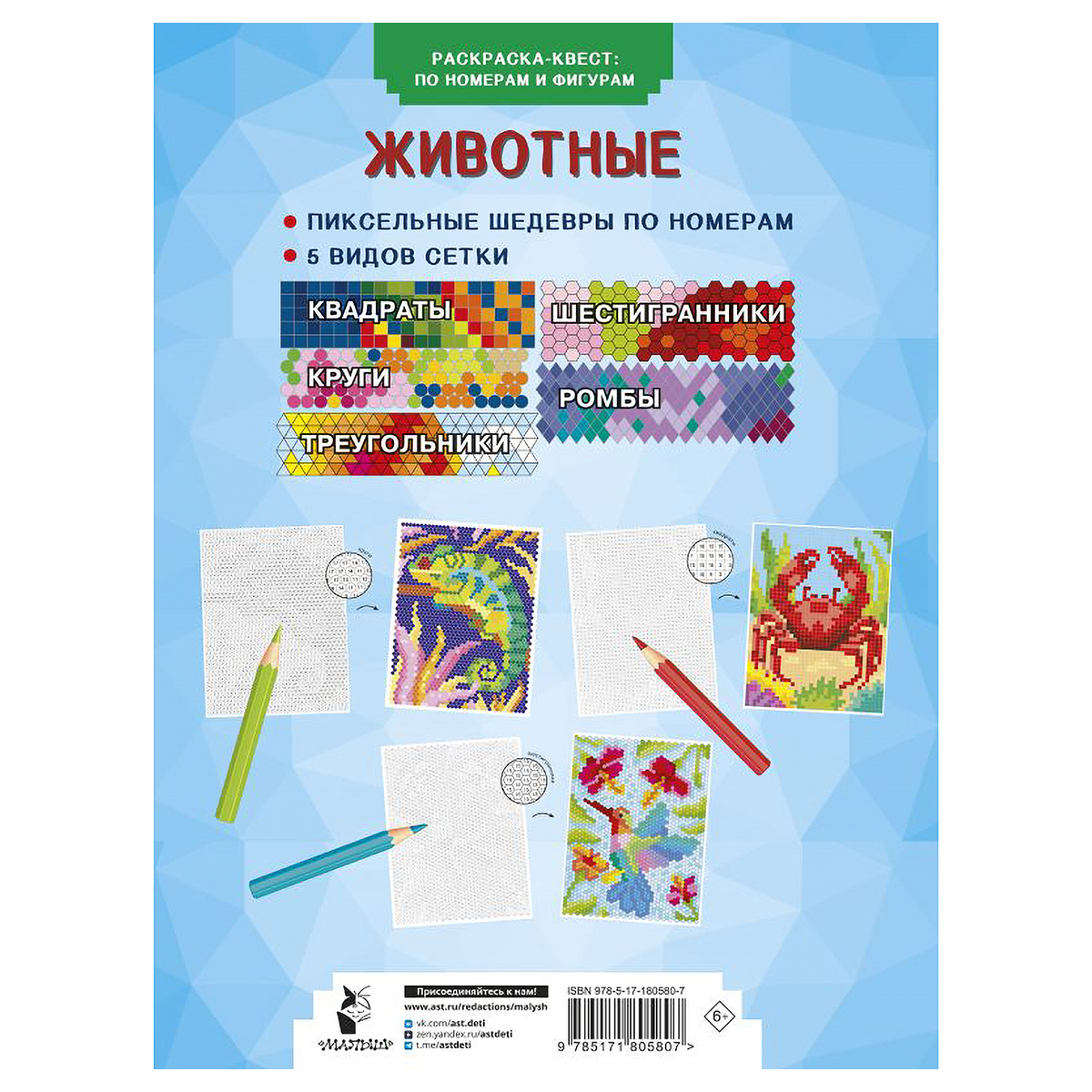 Раскраска по номерам «Животные» — уникальный метод развития и арт-терапия для творческих личностей всех возрастов. Книга-головоломка для создавания пиксельных рисунков в оригинальной технике с использованием геометрических ячеек. Хотите достичь внутренней гармонии и спокойствия — попробуйте шаг за шагом раскрашивать квадраты, круги, треугольники, шестиугольники, ромбы. Для каждой картины предлагается палитра цветов и оттенков — подобрав их по номерам, можно своими руками нарисовать завораживающие анималистичные постеры. Немного усердия — и неповторимый шедевр станет хорошим украшением интерьера или замечательным подарком. Подходит и детям, и взрослым.