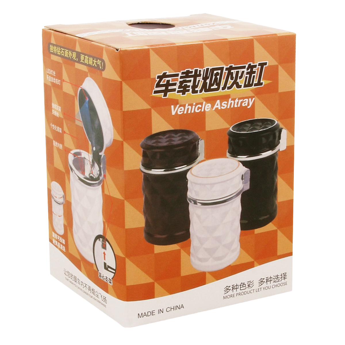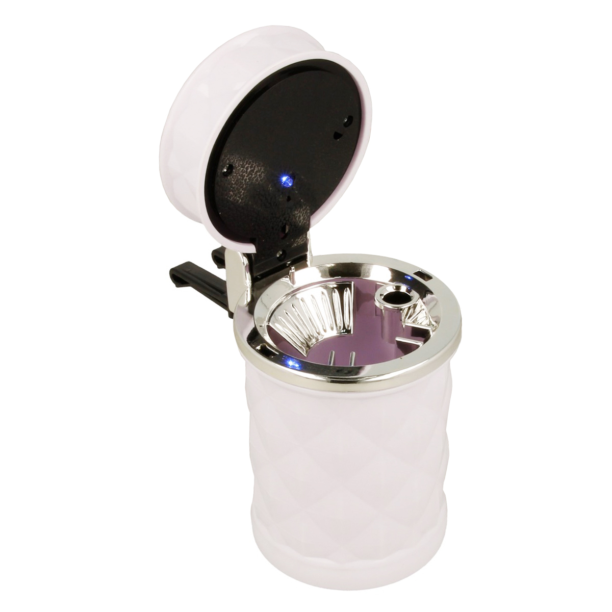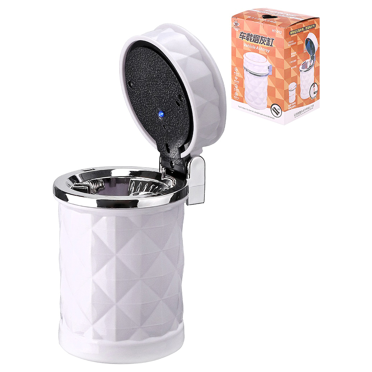 Автомобильная пепельница с крышкой и подсветкой идеально впишется в любой интерьер автомобиля, а также поможет поддерживать порядок в салоне. Особенности: подсветка. Работает от батареек: CR12203V*1 . Материал: пластик, металл. Размер: 11х7 см. Цвет: белый.