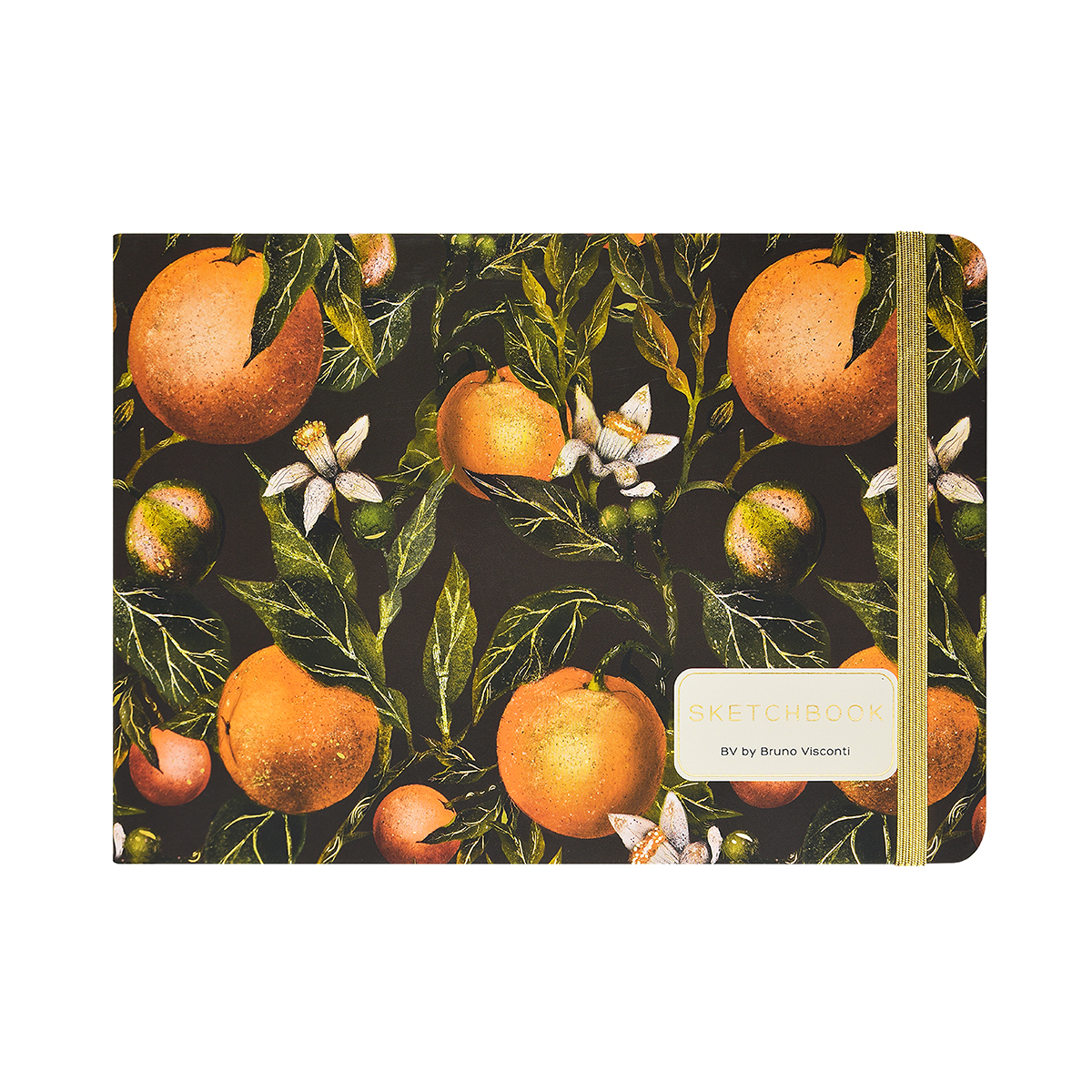 Скетчбук "FLORA.ORANGES" горизонтального открытия в твердом переплете с фиксирующей резинкой.
