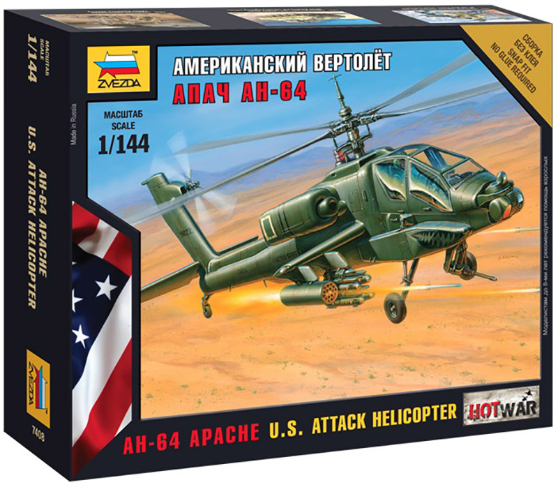 Грозные вертолетные силы ВВС США до 1994 года были вооружены вертолетам Апач. Машина разрабатывалась с опорой на опыт Вьетнамской войны, поэтому отлично подходит для расчистки дороги для своих наземных войск. После 1994 года Апачи стали передавать в национальную гвардию США, однако, до сих пор используются в боевых действиях против стран третьего мира. Американский ударный вертолет Апач, в "модельном" масштабе 1/144, ставшая уже традиционной простая и быстрая сборка без клея, отличная проработка деталей.
