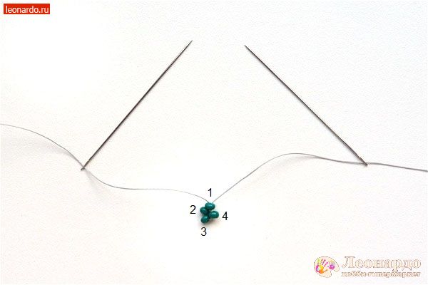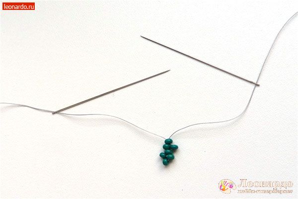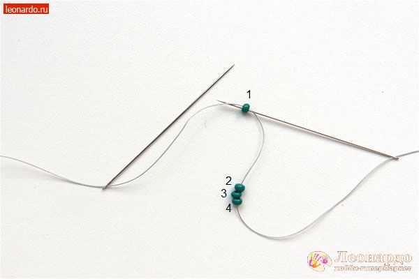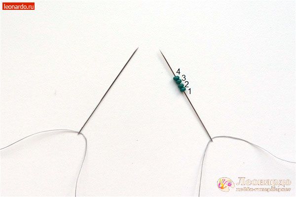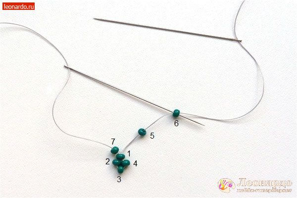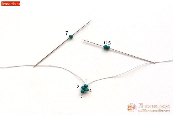 4. Набираем на левую иглу 1 бисерину (7), на правую 2 бисерины (5,6).