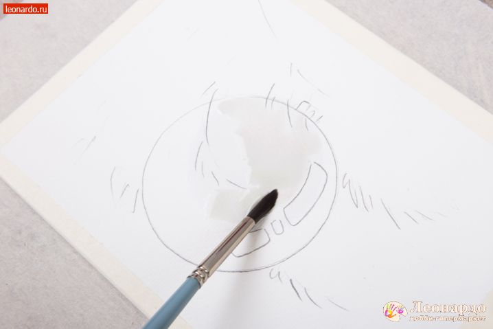 9. Как и при работе с шариком, смочим участки фона чистой водой. В основном это будет часть фона с левой стороны от шарика. Часть фона с правой стороны пока оставим нетронутой.