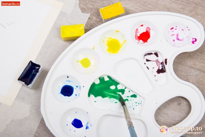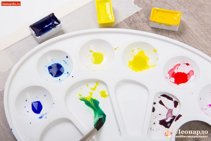 3. Подготовим палитру. Краски смачиваем водой. Небольшое количество каждого цвета добавим в ячейки палитры, чтобы их легче было смешивать.