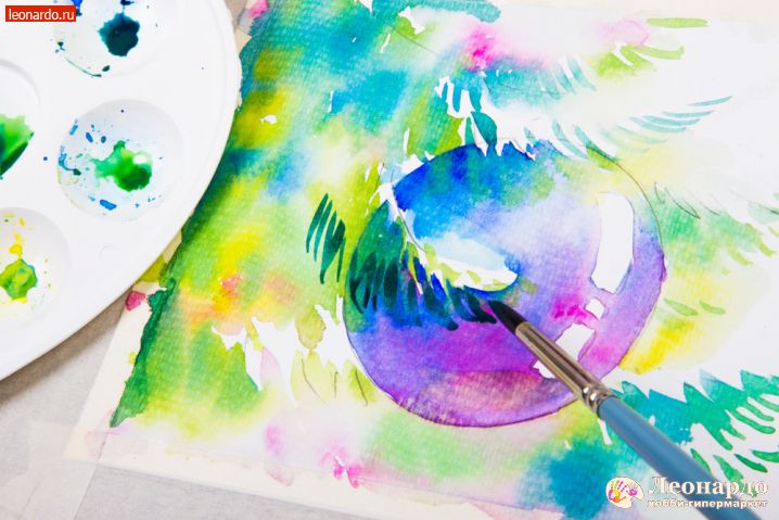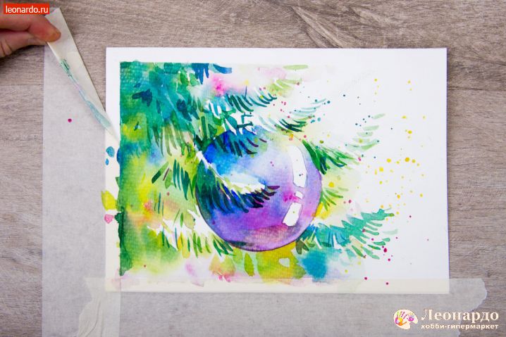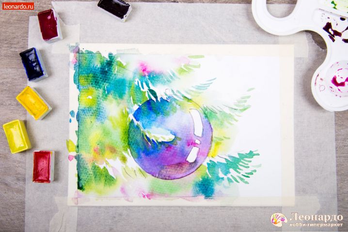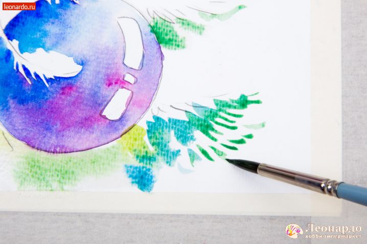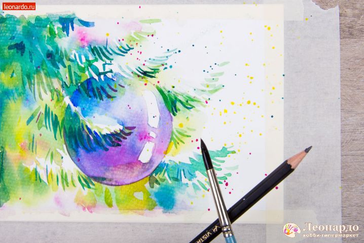 4. Кистью покроем чистой водой внутреннюю часть контура стеклянного шарика, оставив блики и часть еловой ветки на переднем плане. Воды на кисти должно быть достаточно, чтобы она не успевала сразу высыхать на листе. Но и не так много, чтобы на бумаге не образовывались лужи.