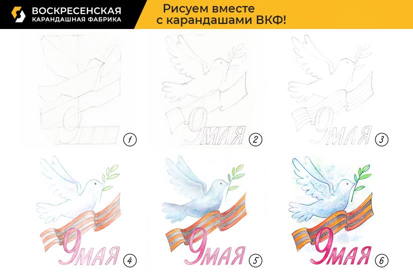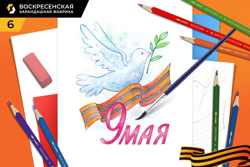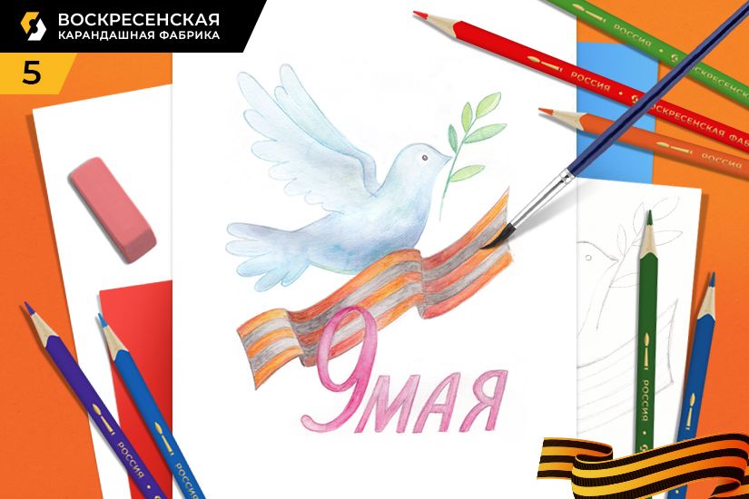 Предлагаем нарисовать тематическую открытку ко Дню Победы! Георгиевская лента – символ памяти и связи поколений. Голубка, несущая оливковую ветвь – традиционный символ мира. Нарисуйте открытку по мастер-классу или разукрасьте в своей цветовой гамме.