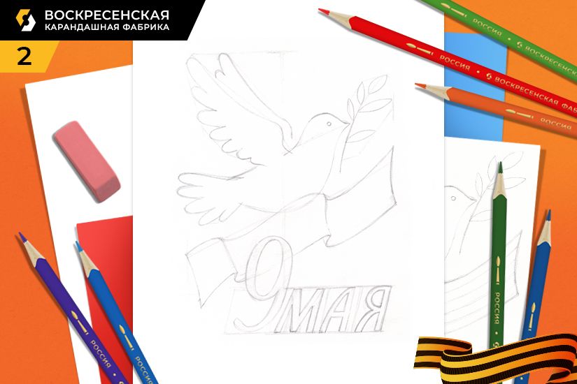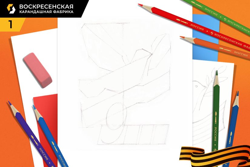 1. Первым этапом в работе является отрисовка эскиза. Для начала следует сделать наброски, контуры будущего рисунка. В центре листа легкими линиями намечаем схематично голубя, Георгиевскую ленту и область для надписи.