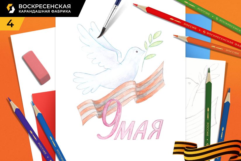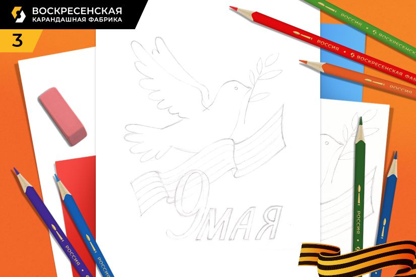 4. Проходим ластиком по всему рисунку, делая контур еле заметным. Штрихуем каждый элемент рисунка легкими линиями. Голубка у нас будет голубого цвета, в местах, где хотим показать тень, объем, наносим штрихи синего и фиолетового цвета. Листья у веточки раскрашиваем желто-зеленым цветом, стебель и контур листьев – зеленым цветом. Надпись штрихуем бордовым цветом. У ленточки полосы делаем оранжевым цветом, к нему добавляем на сгибах красный цвет и штрихи коричневым цветом, чтобы показать объем, другие полосы штрихуем черным цветом. Затем с небольшим количеством воды на кисточке аккуратно размываем штрихи.