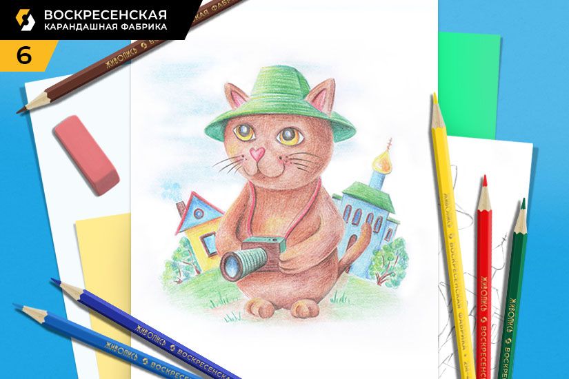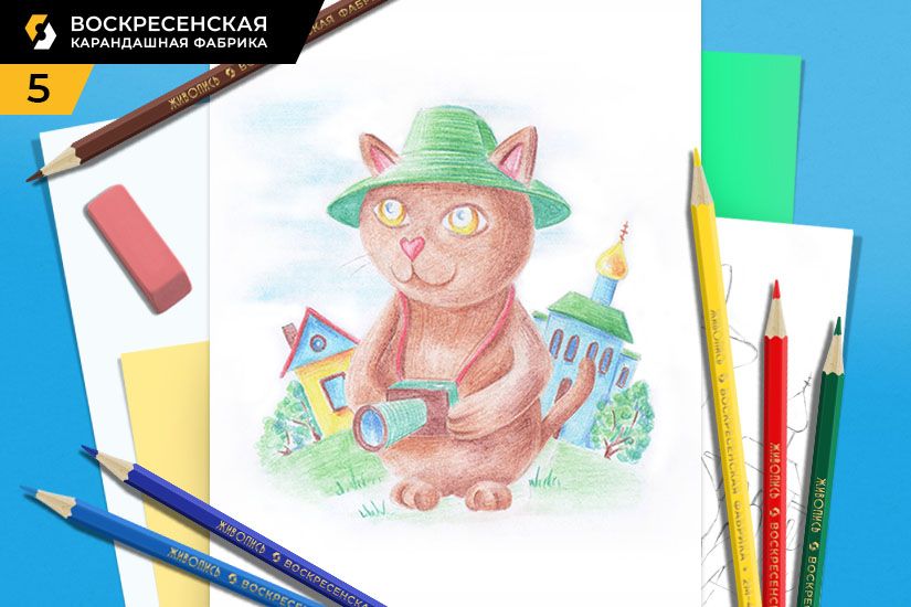 4. Легким движением ластика осветляем карандашный контур. Закрашиваем котика светло-коричневым цветом, усиливая нажим карандаша в теневых местах (на шее, под шляпой, под фотоаппаратом, на стыке пальчиков). Красным цветом рисуем ушки, носик, крышу домика и шнурок фотоаппарата. Голубым цветом закрашиваем церковь, второй ярус домика, окно, блик на зрачках, линзу фотоаппарата и легкими штрихами намечаем небо. Зеленым рисуем шляпу, крышу церкви, опушку и, круговыми движениями, кроны деревьев. Желтым заливаем нижний ярус домика, купол церкви и глазки котика.