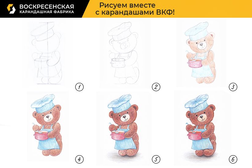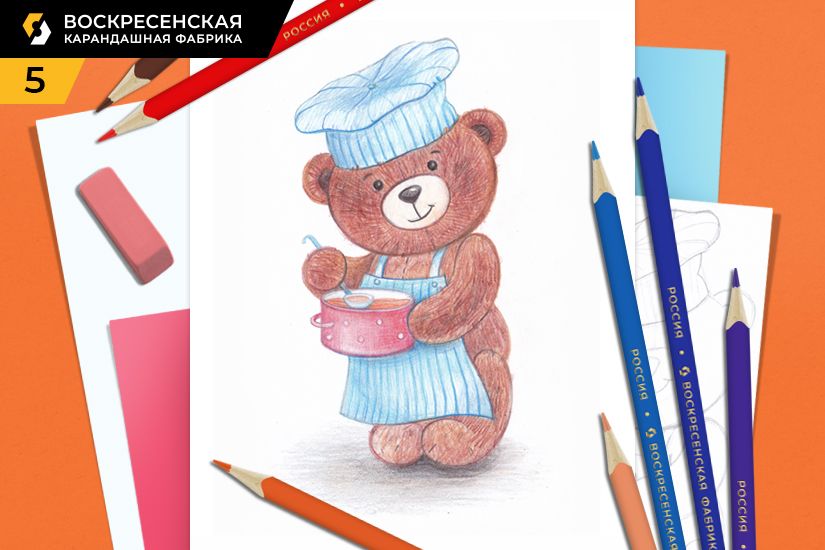 3. Убираем вспомогательные линии построения ластиком. Штрихуем рисунок легкими линиями, ориентируясь на наш образец. Мишку штрихуем коричневым цветом по форме, создавая сразу объем. Фартук и колпак штрихуем голубым цветом, а кастрюлю красным.
