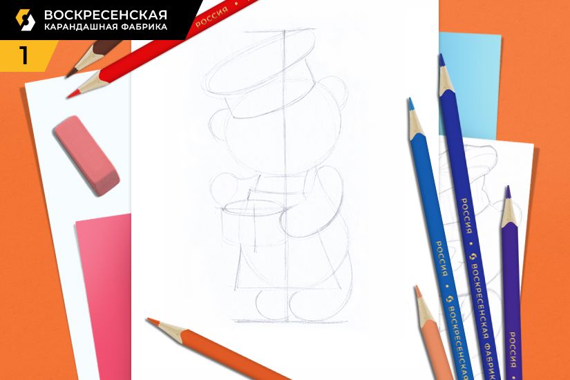 1. Легкими линиями намечаем середину, верхнюю и нижнюю границы рисунка. Намечаем крупные предметы: туловище и голову медведя, поварской колпак, фартук, кастрюлю.