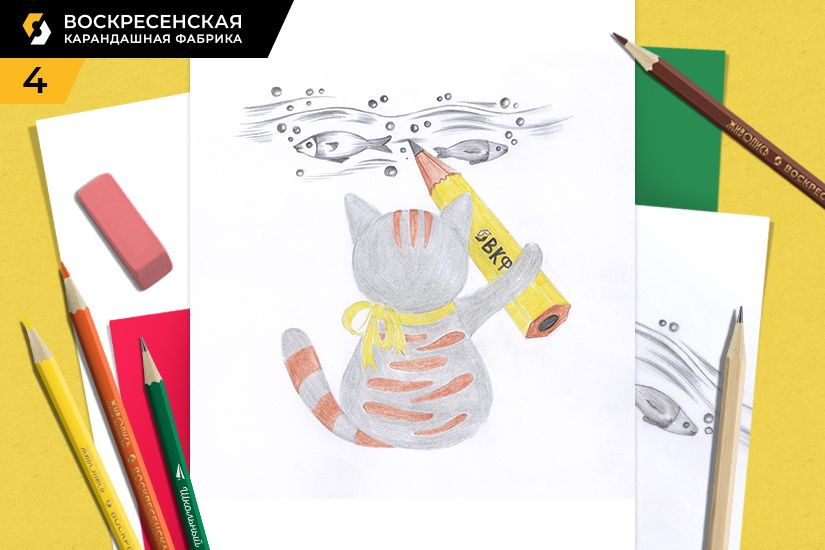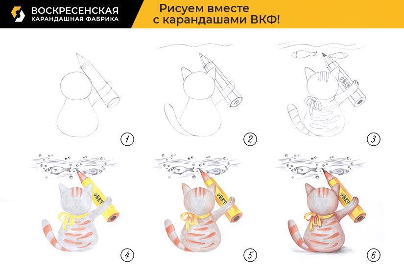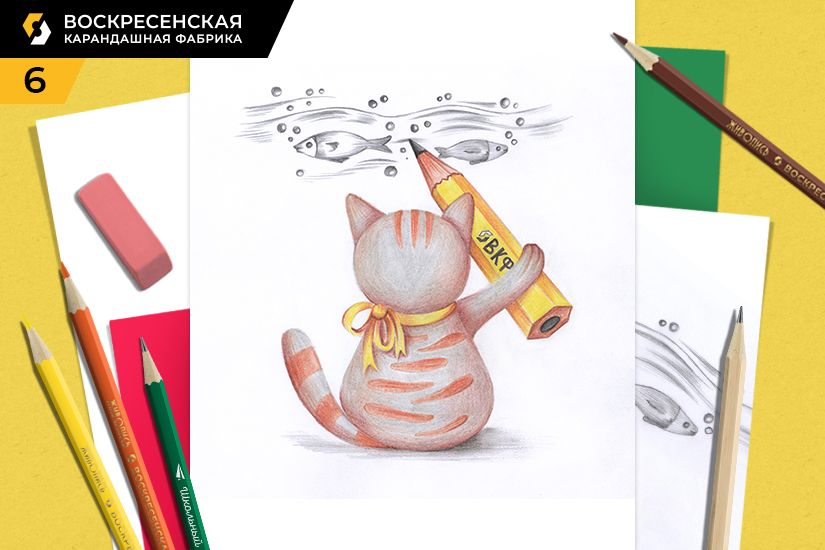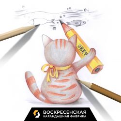 В честь дня графитного карандаша, который в кругу художников отмечают 26 октября, предлагаем нарисовать вам тематический рисунок, милого кота, который с помощью карандашика от Воскресенской карандашной фабрики так искусно рисует рыбок.