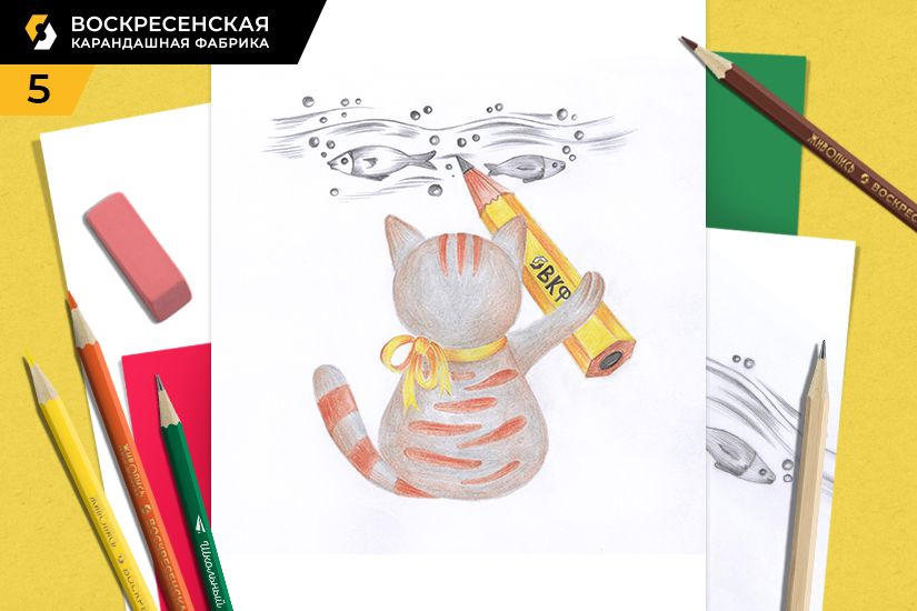 У котика и карандаша (за исключением грифеля) убираем карандашное построение и добавляем цвет.