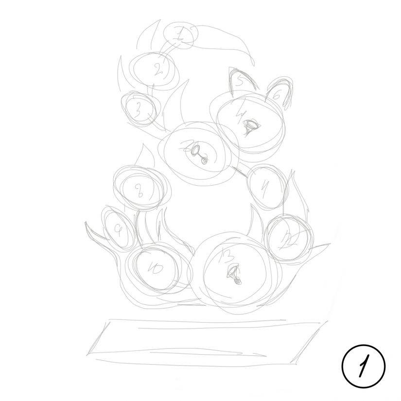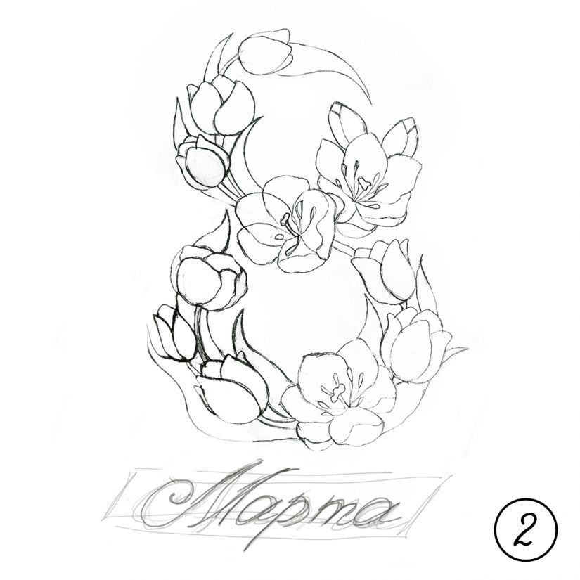 1. Первым этапом в работе является отрисовка эскиза. Размечаем форму будущей восьмерки, цветочную композицию с нечетным кол-вом элементов, а также определяем место, где будет надпись.