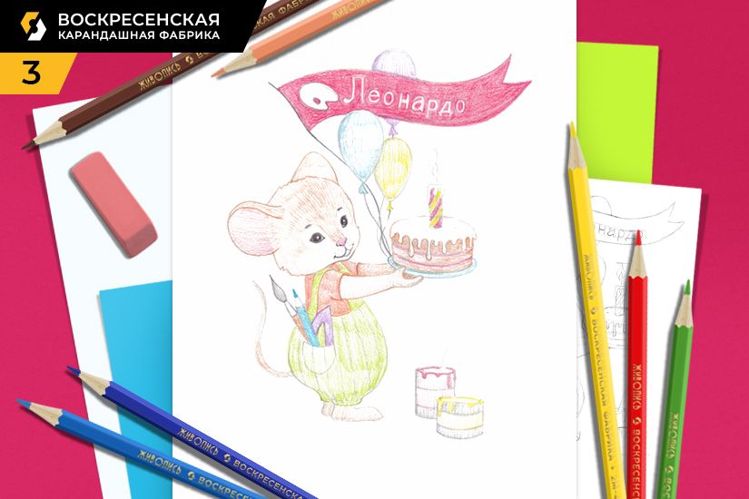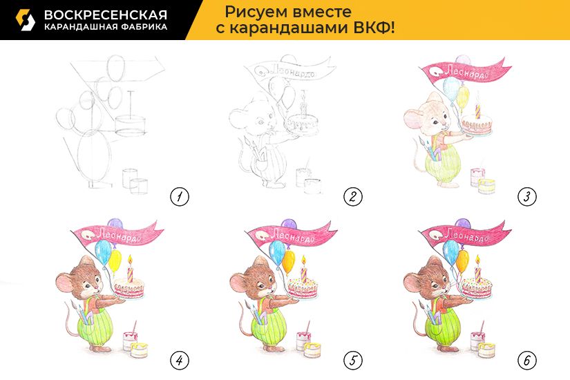 2. Детально прорабатываем рисунок, торт, мордочку и костюм мышонка, банки с краской. После проработки убираем лишние, вспомогательные линии ластиком. Пишем надпись.