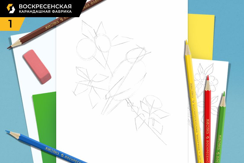 1. В центре листа легкими линиями и простыми формами (круги, прямоугольники) намечаем ветку и птицу на ней.