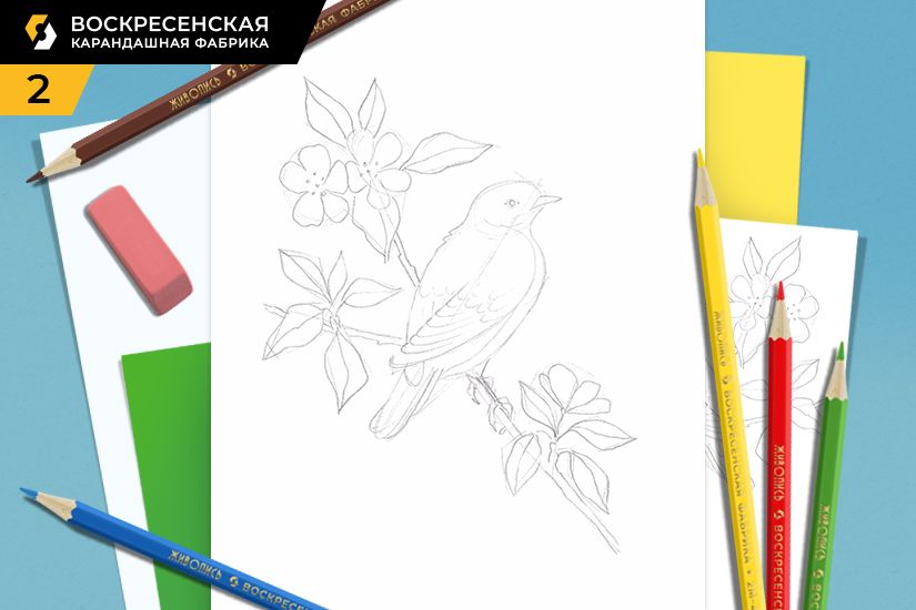 2. Детально прорабатываем рисунок, цветы и нашу птичку. Убираем лишние и вспомогательные линии ластиком.