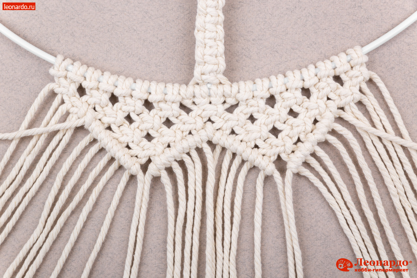 25. На внутренний диаметр навешиваем 92 нити длиной по 58 см. Закрепляем их замочком на лицо по схеме №3. Выравниваем нити.