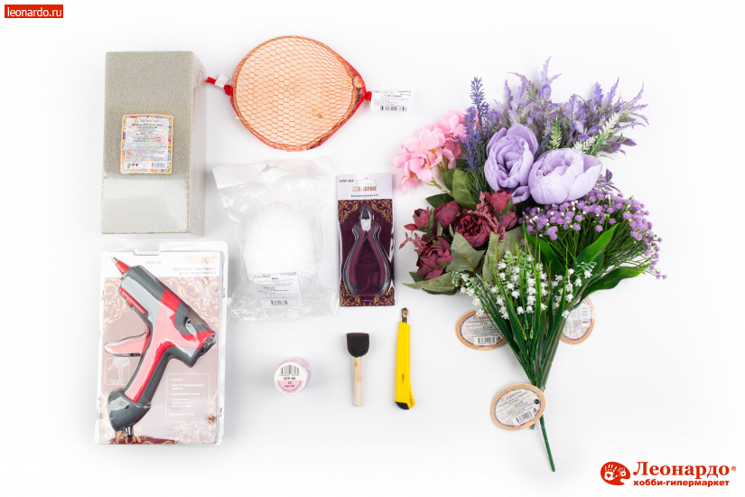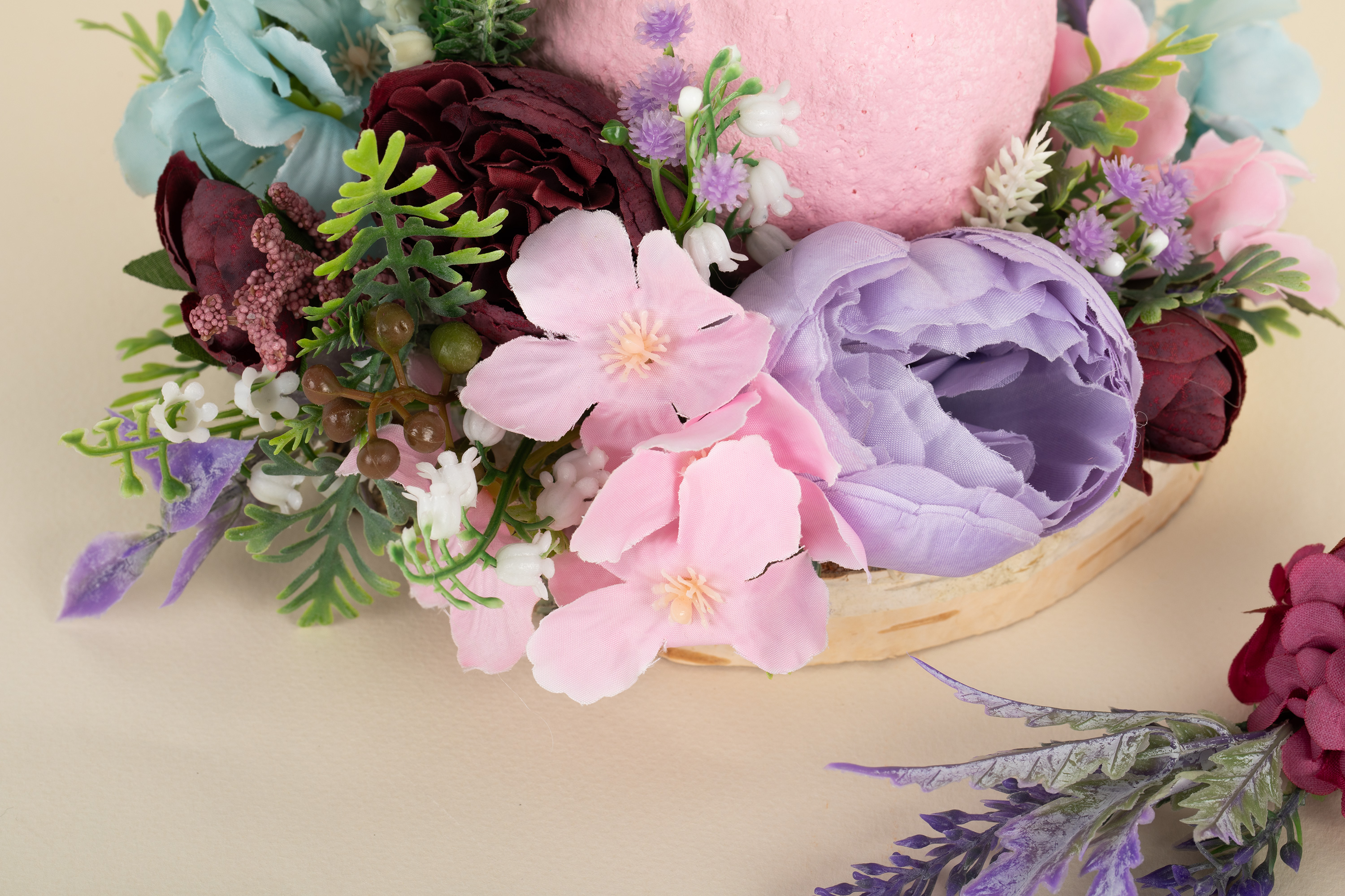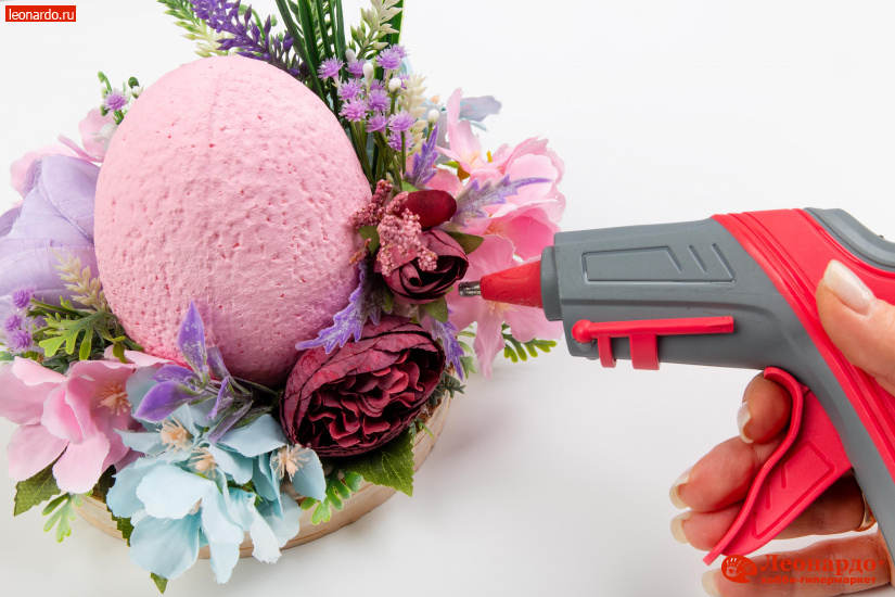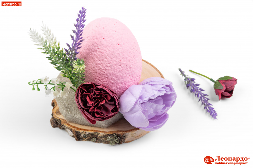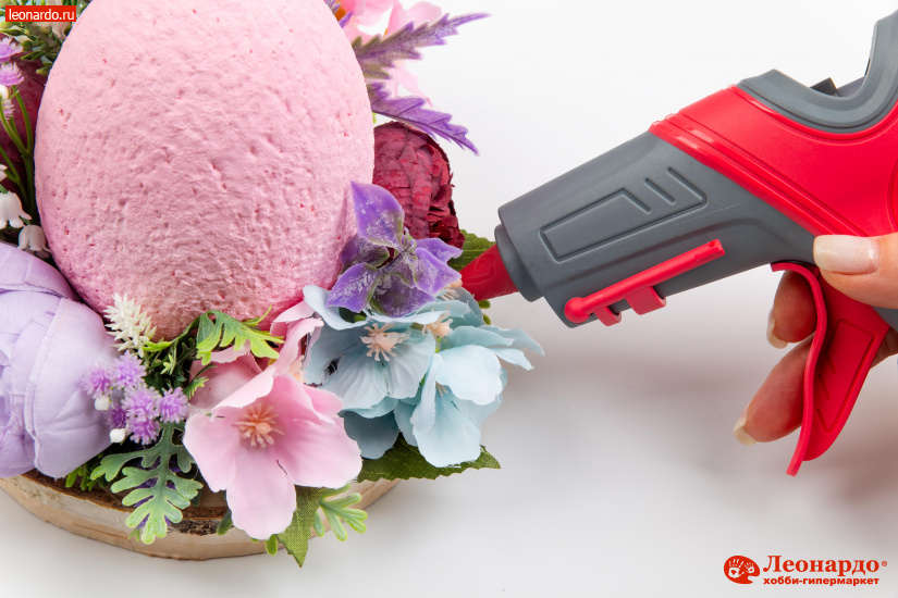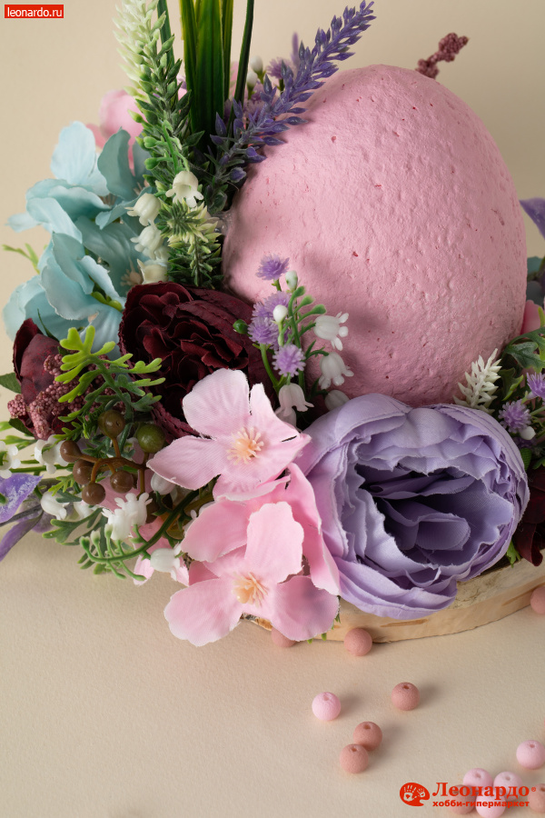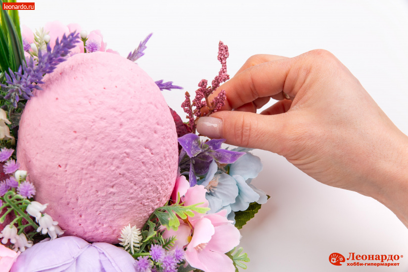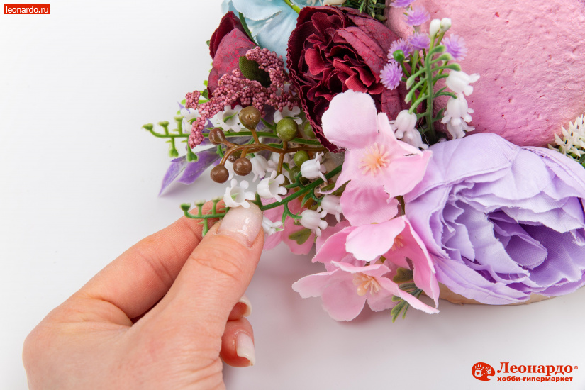 9. На тех участках, где нет пены, листья и цветы вокруг яйца приклеиваем к срезу. Заполняем полностью оверхность среза.