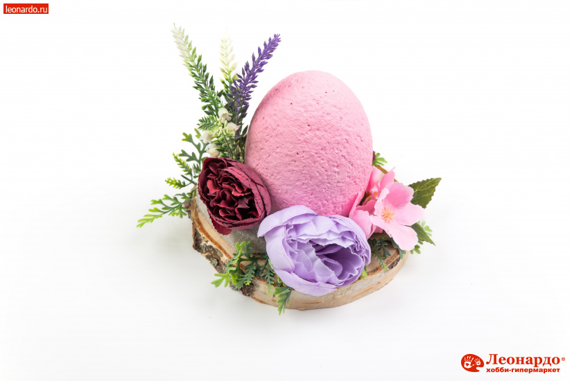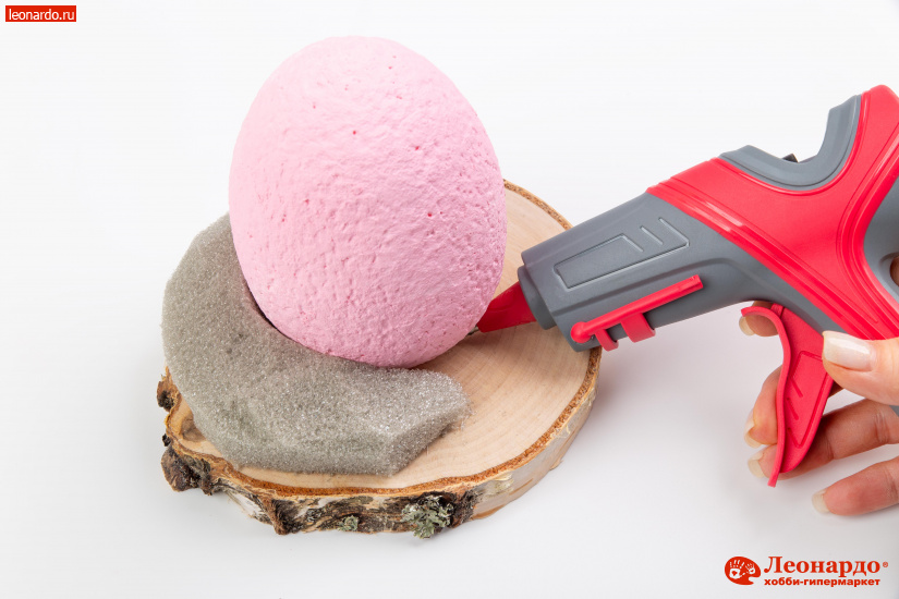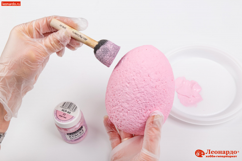 1. При помощи поролоновой кисти и акриловой краски окрашиваем в розовый цвет заготовку яйца из пенопласта.