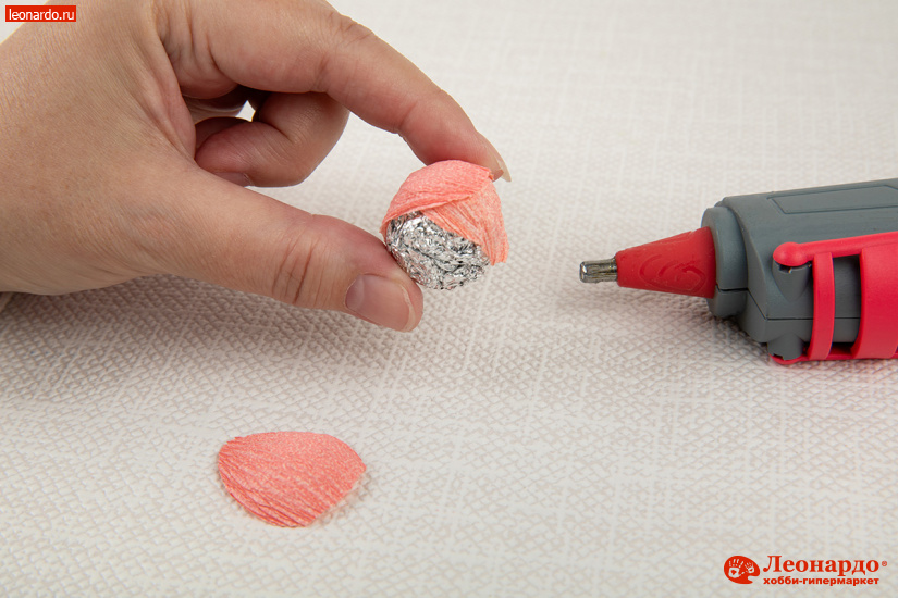 1. Изготовление бутонов. Из фольги вручную формируем плотный шарик диаметром 3 см. Розовую гофрированную бумагу нарезаем на полоски высотой 3,5 см и шириной 2 см. Каждую полоску складываем вертикально пополам и вырезаем симметричный лепесток в форме «капельки». Всего для круглого бутона понадобится 5-7 таких лепестков.