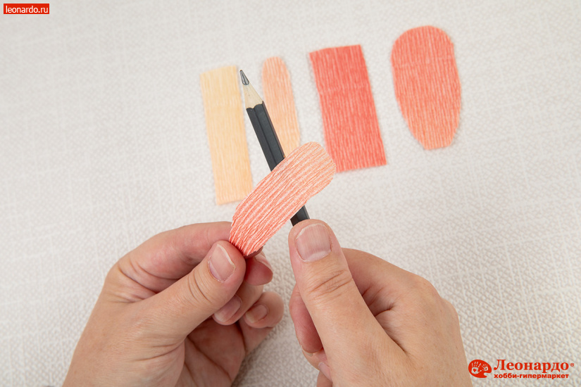 6. Слегка «подкручиваем» заготовки лепестков по направлению снизу вверх с помощью простого карандаша, создавая плавный изгиб.