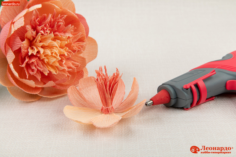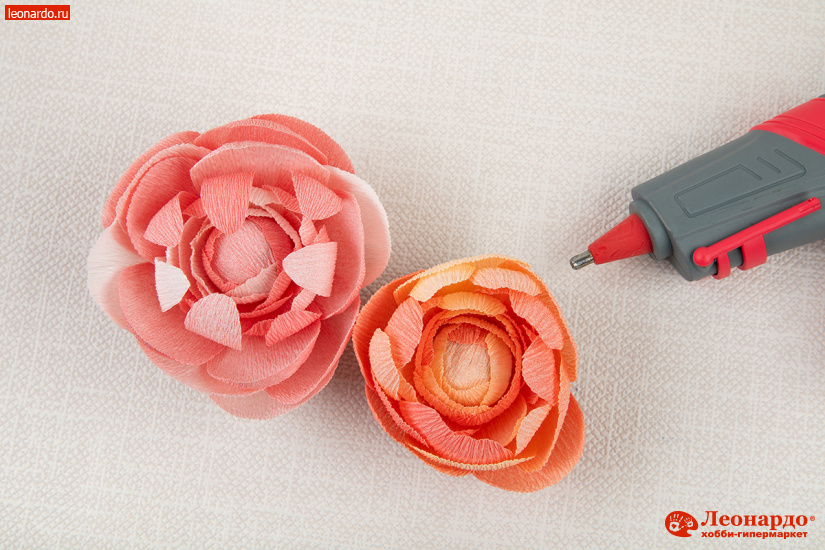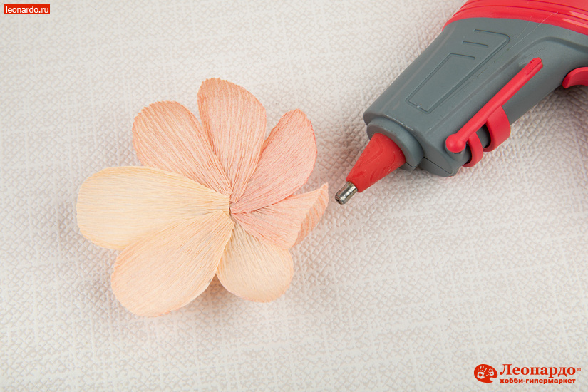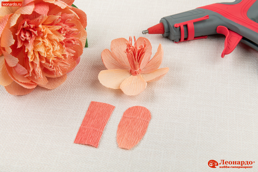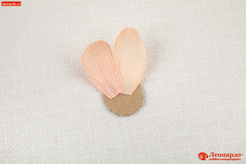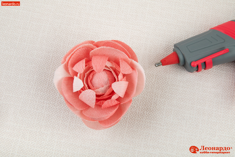3. Особенность гофро-бумаги состоит в том, что благодаря складчатой структуре она легко растягивается и в дальнейшем сохраняет естественные для цветов выпуклость и объем. Слегка растягиваем бумажные заготовки пальцами в центре, придавая им округлую форму. Затем поочередно наклеиваем лепестки вокруг бутона, располагая вертикально и немного «внахлест» друг на друга.