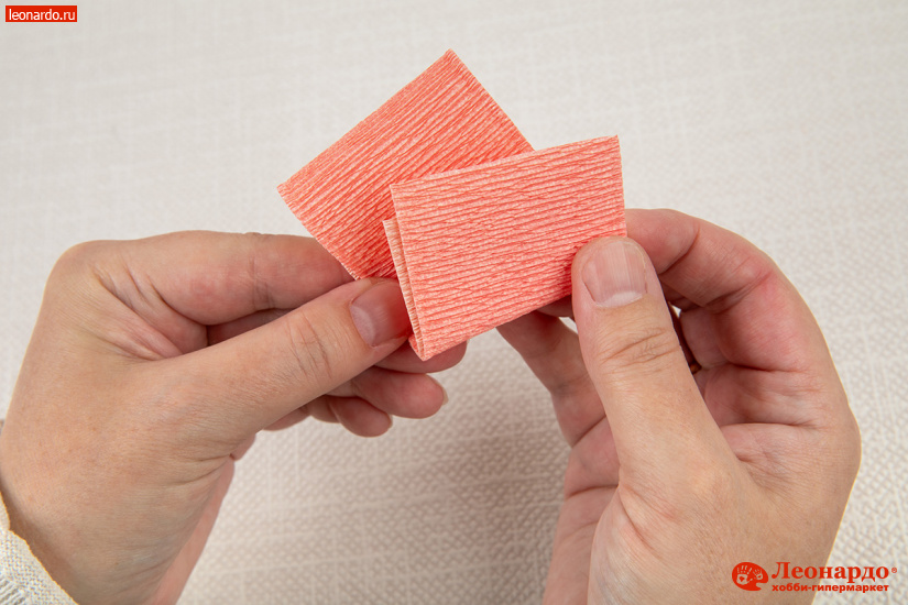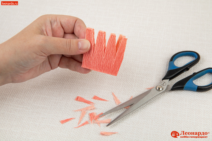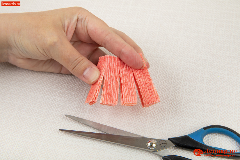 17. После этого складываем полоску «веером» и перевязываем у основания ниткой в тон бумаге. Для сердцевинки одного пышного цветка понадобится 8 махровых пучков.