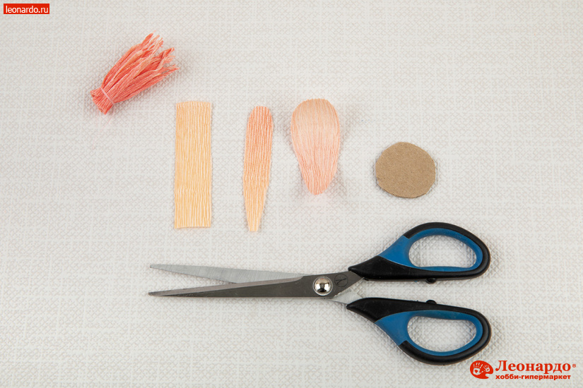 18. Для основы цветка вырезаем из картона круг диаметром 3-4 см. Также заготовим 7-8 полосок розовой бумаги для средних лепестков. Придадим им полукруглую форму.