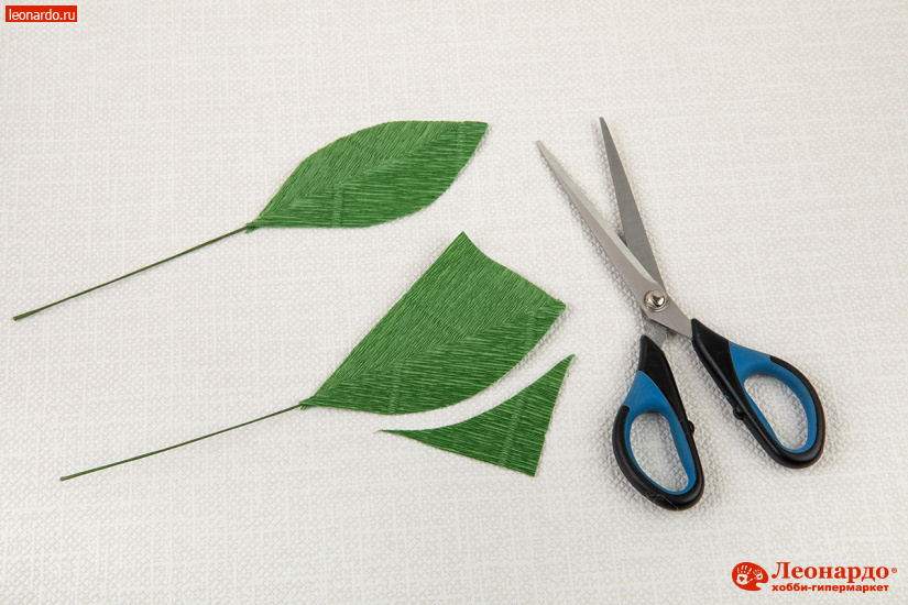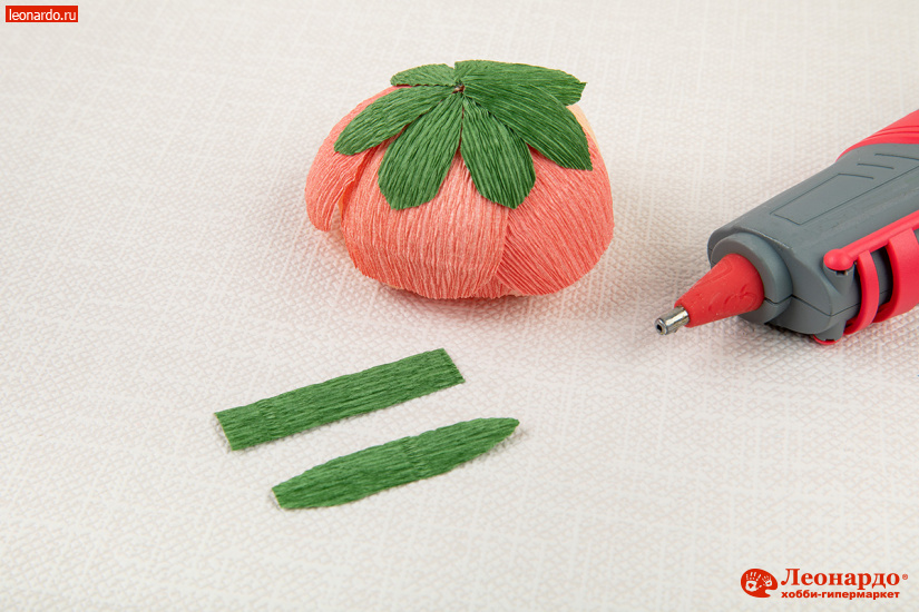 22. Чашелистники для цветов делаются из 7-8 полосок зелёной бумаги высотой 6 см и шириной 2 см. Каждую полоску складываем вертикально пополам, края закругляем. Наклеиваем зеленые лепестки с обратной стороны цветка.
