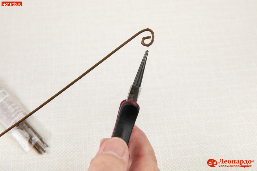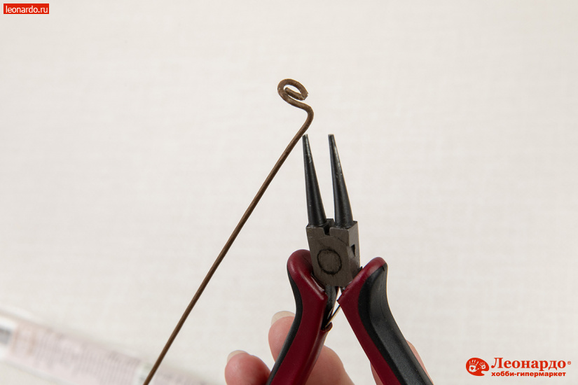 23. Стебель делается из флористической проволоки. Для пышных цветов на конце проволоки с помощью круглогубцев формируем «петельку». Отгибаем ее петельку под прямым углом.