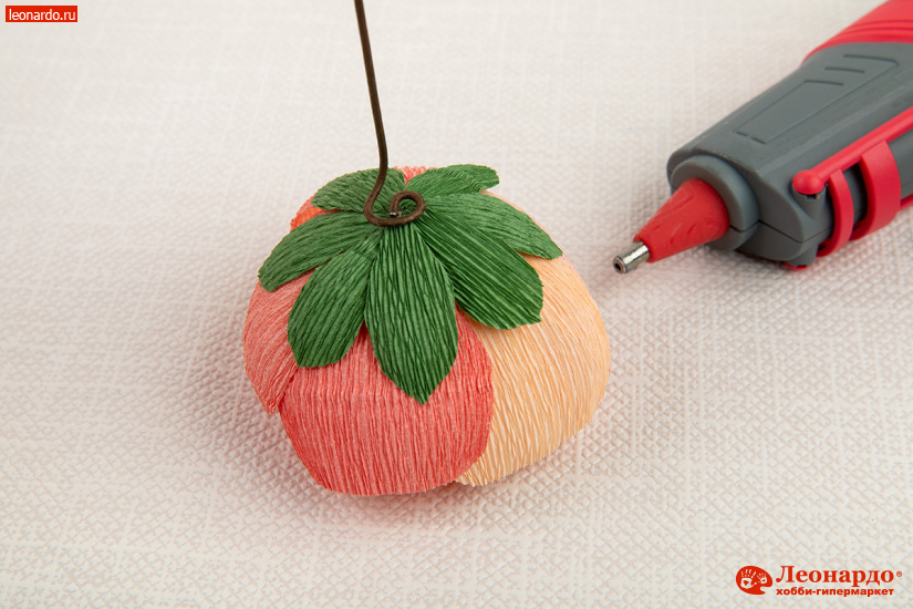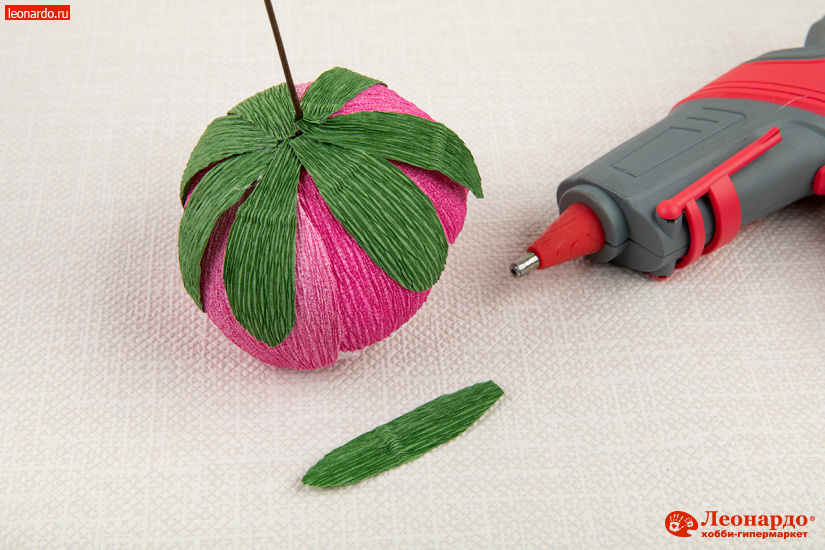 2. Первый лепесток приклеиваем на вершину шара горизонтально. Плотно прижимаем края лепестка к поверхности шара, оба конца подклеиваем с помощью клеевого пистолета.