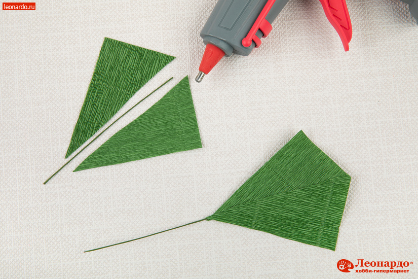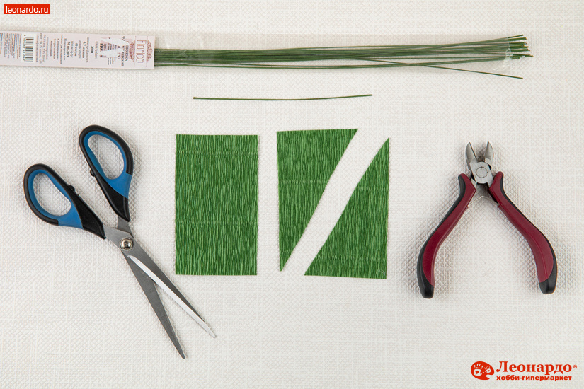 26. Листья вырезаются из зелёной бумаги. Прямоугольники высотой 10 см и шириной 6 см разрезаем по диагонали на 2 треугольника. Готовим по количеству листьев отрезки тонкой проволоки длиной 20 см.