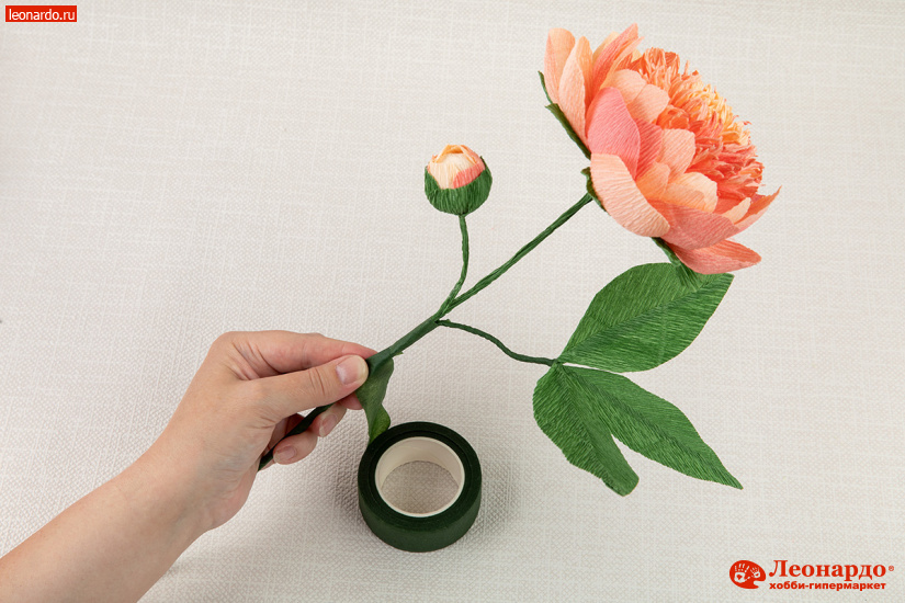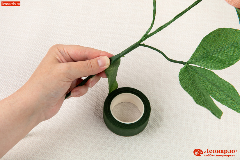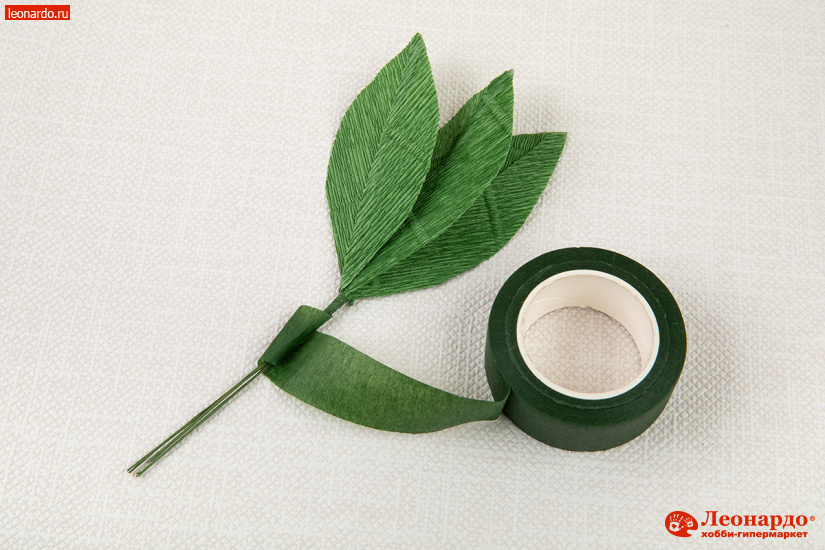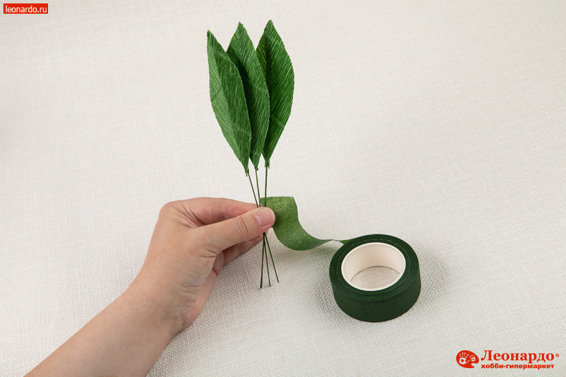 30. Начинаем обматывать стебли флористической лентой, закрепив ее клеем у основания. Плотно укладываем витки ленты со смещением сверху вниз.