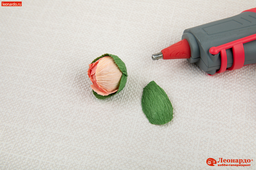 4. Для чашелистника дополнительно сделаем 4-5 лепестков такого же размера из зеленой бумаги. Также растягиваем их в центральной части до округлого состояния. Приклеиваем вертикально на половину высоты бутона.